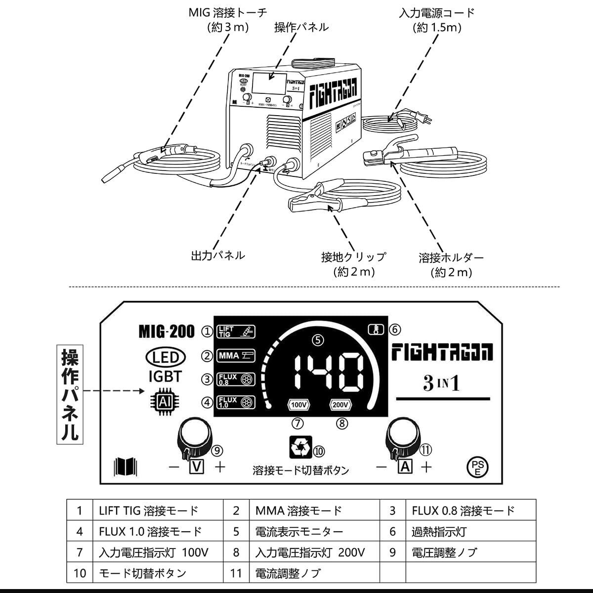 [FIGHTAGON]溶接機 半自動溶接機 MIG200 LED表示 防災 最大出力140A 1台3役 ノンガスMIG·被覆アーク·LIFT TIG 100V/200V兼用 50/60HZ ノンガス半自動溶接機 アーク溶接機 定格使用率60% インバーター搭載 小型 軽量 家庭用 初心者向け 説明書付き