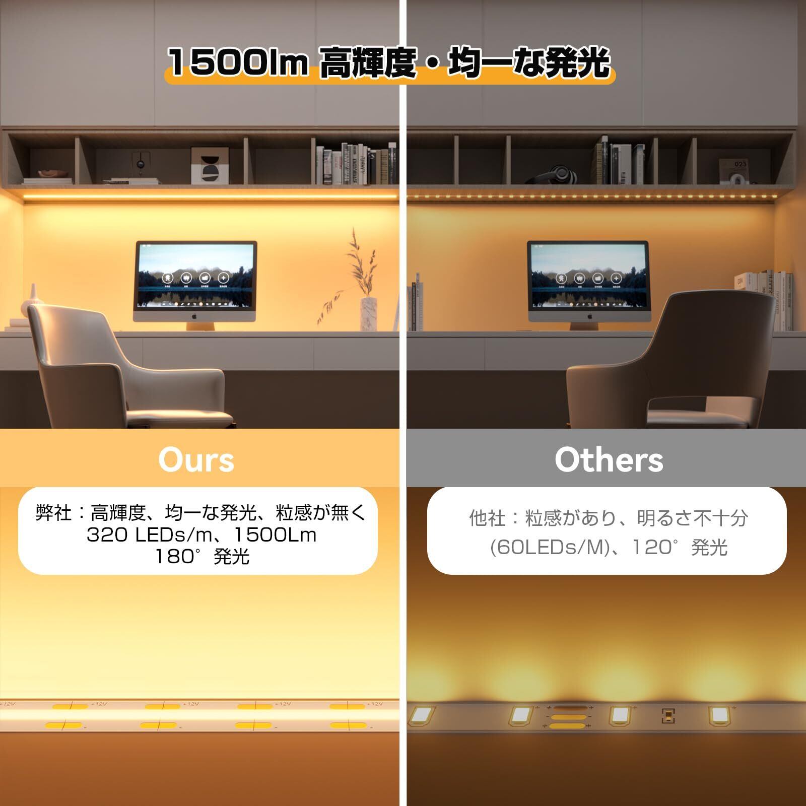 【1500lm・960LED・プロ仕様の高演色照明テープライト】Ra>90の超高演色性を実現!太陽光に近い自然光で、食材の鮮やかさやインテリアの質感を忠実に再現。COB技術による均一光で、目に優しい快適な照明環境を提供し、長時間の作業でも疲れません。