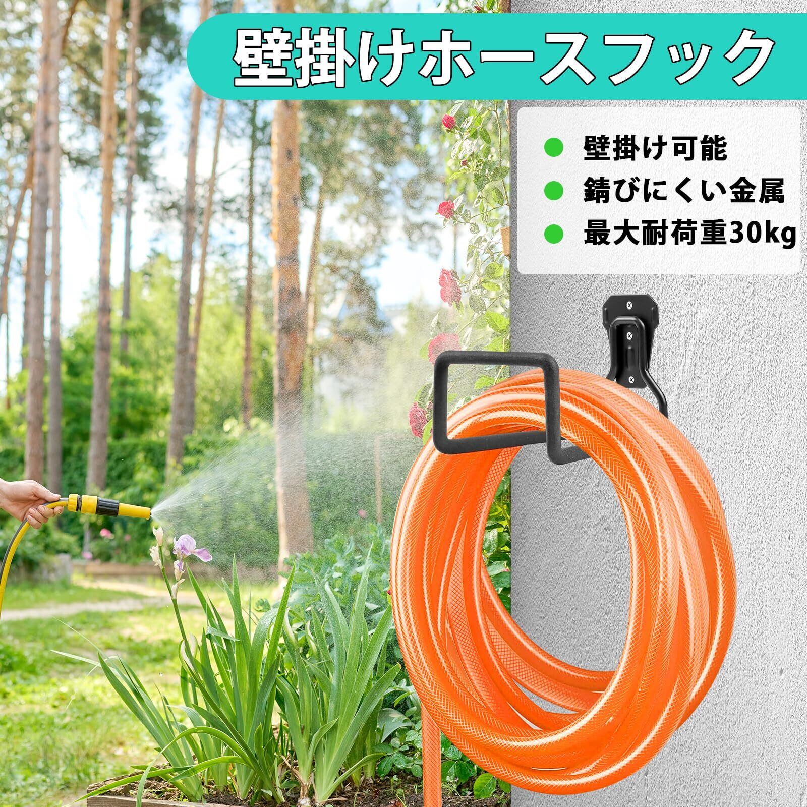 【商品の仕様】 サイズ:長さ19.5CM*幅12CM*高さ13CM(三つの穴の側);カラー:黒、材質:鉄+PVC、パッケージ内容:ホースフック×1、直径3.8mmネジ×2、直径4.8mmネジ×2、拡張チューブ×4。 ホースホルダーは30kgまでの強力な耐荷重を持っています(25メートルまでの散水ホースなら何でも収納可能)。