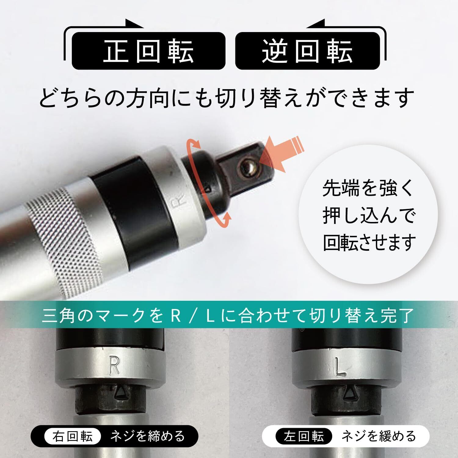 【多用途】:ソケットの交換が可能で、差込角1/2DR(12.7sq)の差込みであれば使用することもできます。正回転(R)・逆回転(L)のどちらにも回転方向を指定することが可能です。※ネジ外しは(L)に合わせます。実使用前に回転方向を確認してください。