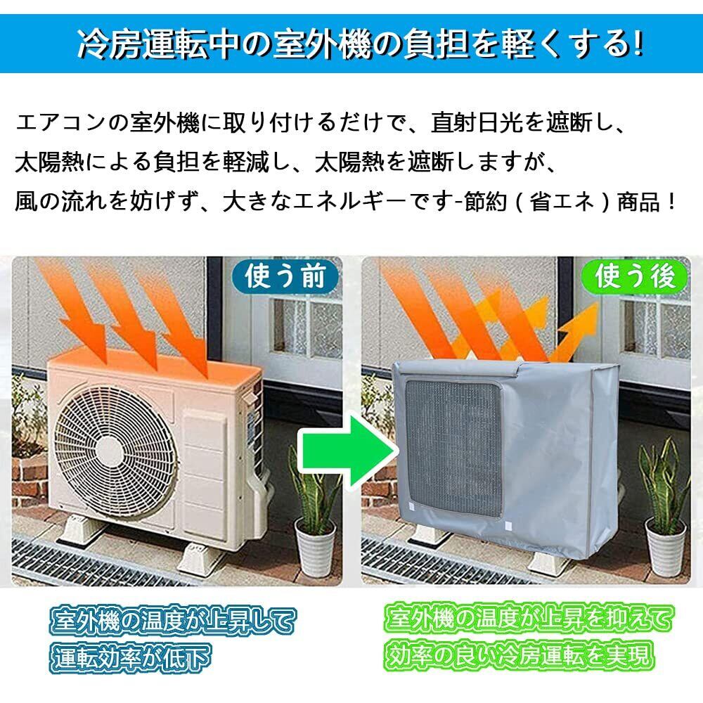 【悪天候対策】本室外機遮熱カバーは撥水加工生地を採用しているので、雨水を撥ね付け、泥やホコリなどがこびりつくのを防止できます。耐候性に優れているので、四季通用の素敵製品です。夏場や台風や、梅雨などの雨の季節には飛散した泥水や葉が室外機中に入り込むのを防ぎます。縛っておけば台風でも飛んで行かないし、寒冷地で積雪にも耐えて破損もしてないので堅牢性が高いです。エアコン必要がない季節はカバーも取り外し不要でとても便利です。 (ご注意事 項:室外機側面などの「通風孔」をふさがずにご利用ください。)