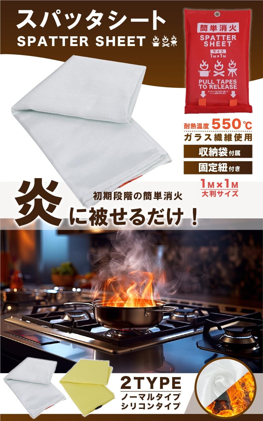 「ファイヤーガード スパッタシート」は、家庭やオフィスでの火災の初期消火に最適な防火シートです。高品質な耐火素材で作られており、耐熱温度は550℃と火災の初期段階では十分な性能で、迅速な消火に対応できます。緊急時にサッと取り出せるため、火災時のパニックを軽減し、迅速な消火が可能です。 このスパッタシートは、ノーマルタイプとチクチクしないシリコンコーティングタイプの2種類をご用意しています。どちらのタイプも高い耐久性と信頼性を誇り、繰り返し使用することができます。大きさは1m×1mで、初期消火には十分なサイズです。 また、軽量&折りたたんで収納袋に入れられるので持ち運びに便利です。キッチンやオフィスのデスク下など、スペースを取らずに収納できます。キャンプやBBQなどのアウトドア活動にも最適で、火の取り扱いが必要な場面での頼りになります。 「ファイヤーガード スパッタシート」は、多用途であり、家庭、オフィス、アウトドアのどこでも使用できます。繰り返し使用できるため、使い捨てではなく環境にも配慮した設計です。高品質な耐火素材と使いやすさを兼ね備えたこの消火シートは、火災時の迅速な対応を可能にし、大切な人や財産を守るための頼もしいアイテムです。 今すぐ「ファイヤーガード スパッタシート」をお求めいただき、火災に対する備えを万全にしましょう。初期消火のための必需品として、ご家庭やオフィスに常備することをお勧めします。