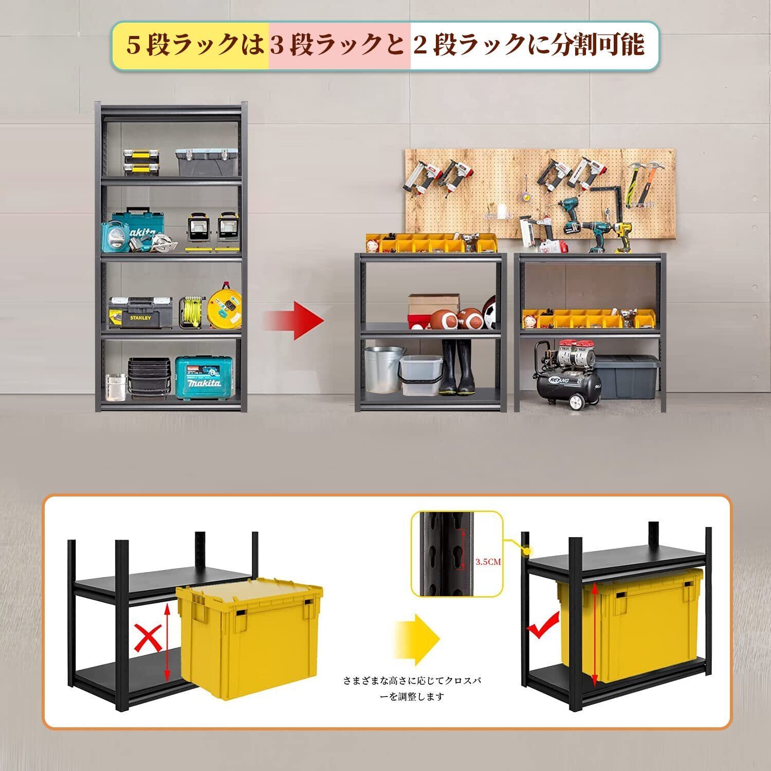 【調節可能な収納ラック】金属製の棚は取り外し可能な2つのユニットで構成されており、必要に応じて別々に使用できます。 収納ラックの高さは、さまざまな収納要件に合わせて自由に調整できます。 3段目のみ固定で高さ調節不可、残りの4段は自由に高さ調節できるので、整理・収納したい物のサイズに合わせて調節でき、ガレージ整理・収納棚としても優秀。