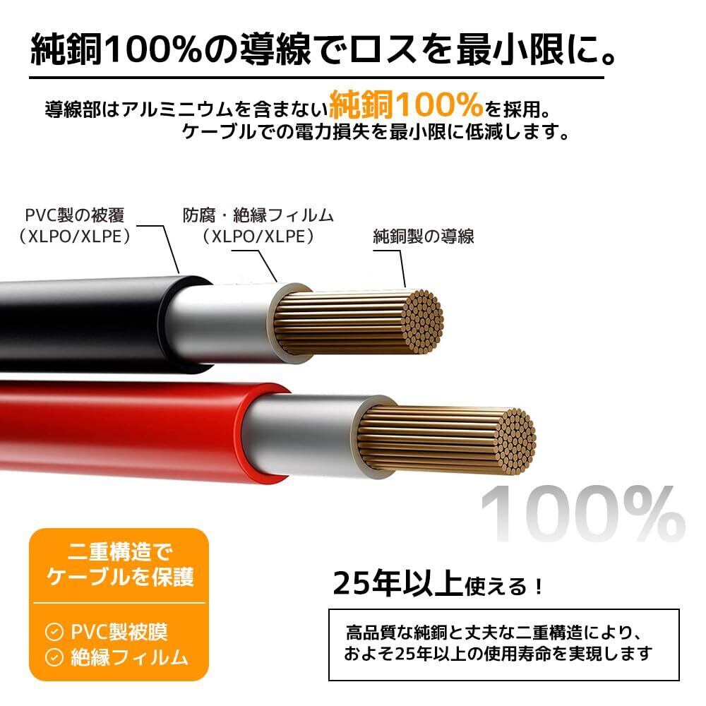 ◆【良質な素材】ソーラー充電ケーブルは、頑丈で耐久性のある13AWGの銅線と二重のPVCジャケットで製造されています。長さは約5メートルで、定格電圧は最大で1500V(DC)です。耐熱性も高く、-30℃から最高で90℃の高温にも対応しています。