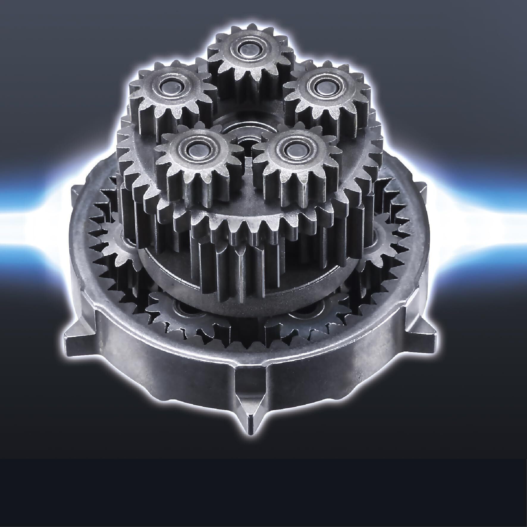 オールメタルギヤで高耐久。薄型ギヤで小型化、多数ギヤで高耐久。