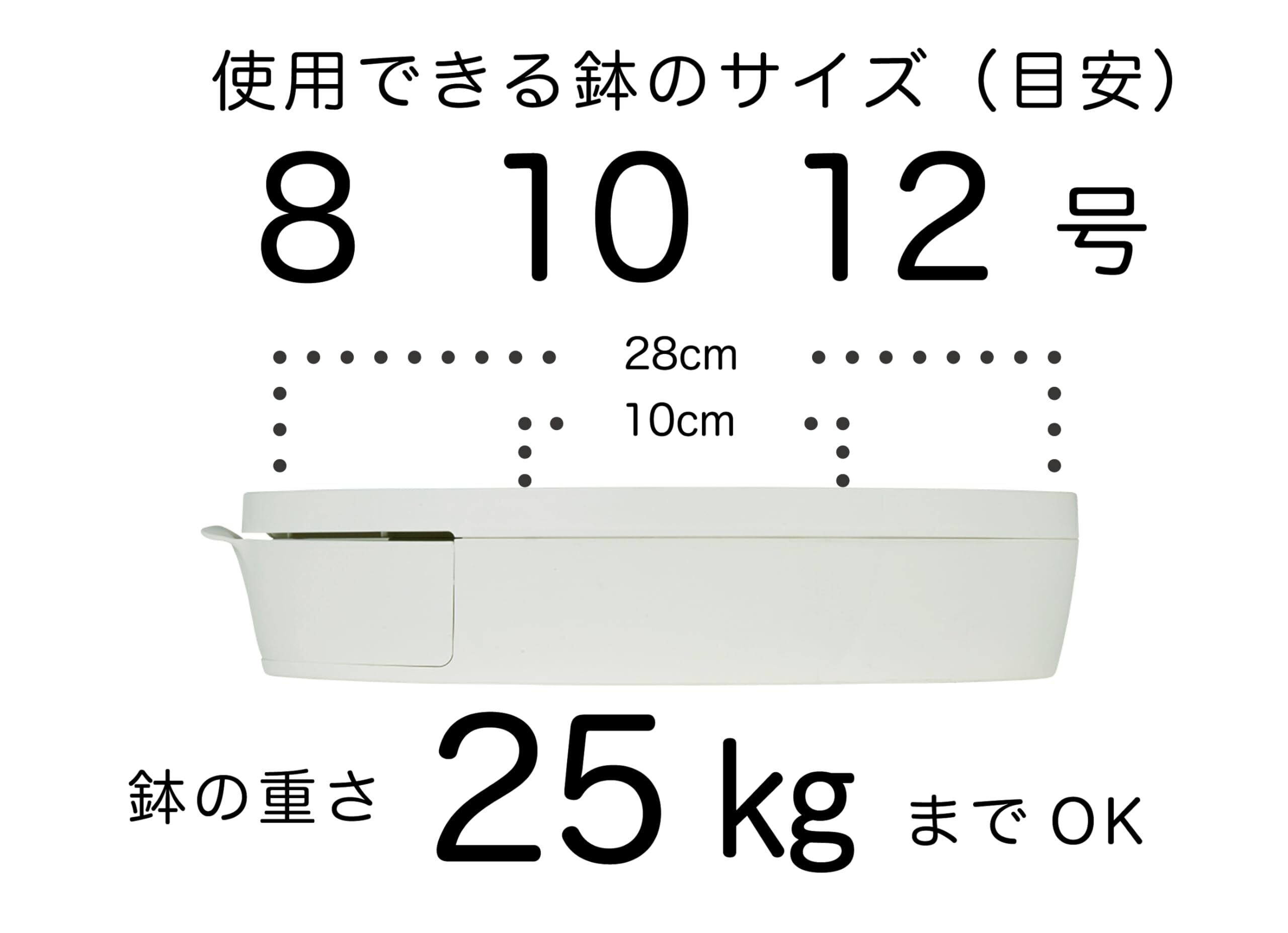 本体サイズ:直径29×高さ6.5cm /重量:1400g 天板(鉢を乗せる面)28cm / 耐荷重:25kgまで / 貯水量:1.2ℓまで カラー:ホワイト トレイと本体の特徴:トレイを動かしたときに水が飛び出しずらい特殊設計。トレイがない時でも水が床にこぼれないように一体型モデル 素材: 石灰石(およそ50%) ポリプロピレン 製造国:日本