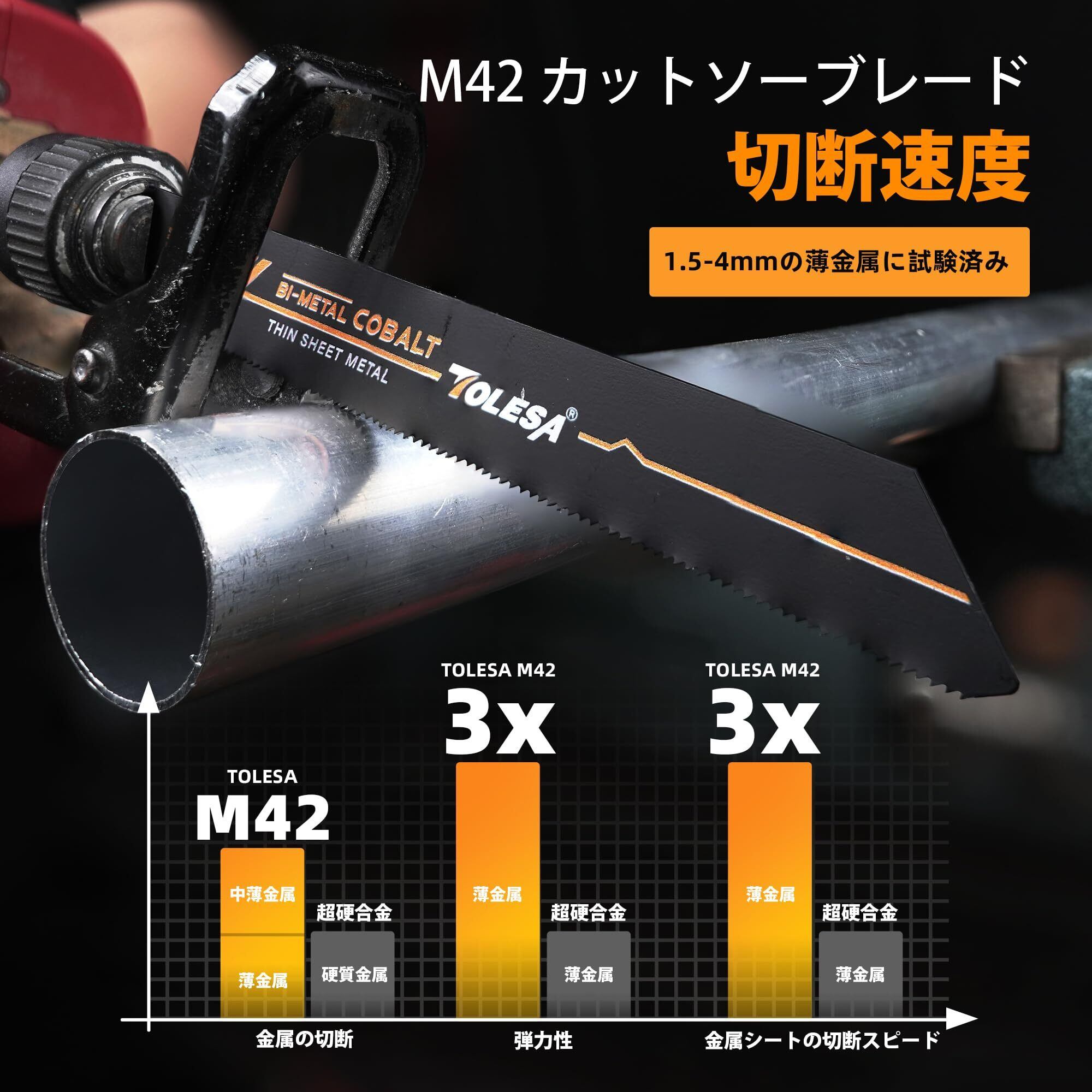 【高品質なM42バイメタル】TOLESAの高品質なM42バイメタルは8%のコバルトを含み、通常のバイメタル刃よりも耐熱性と耐久性が向上しています。また、強靭性も備えており、折れずに曲がることができます。