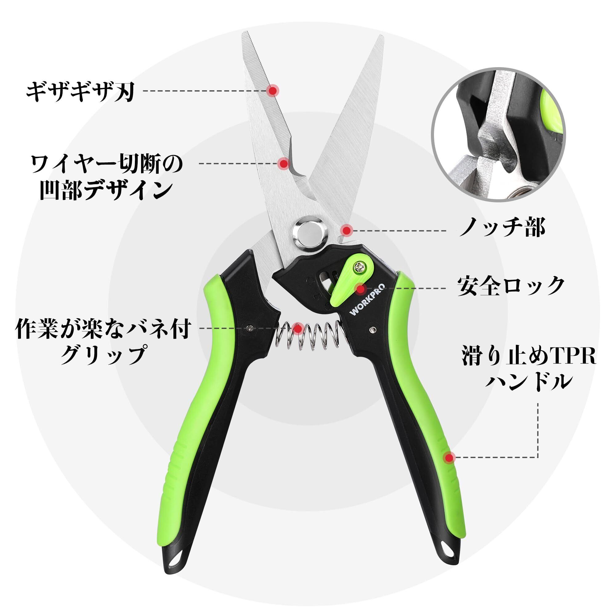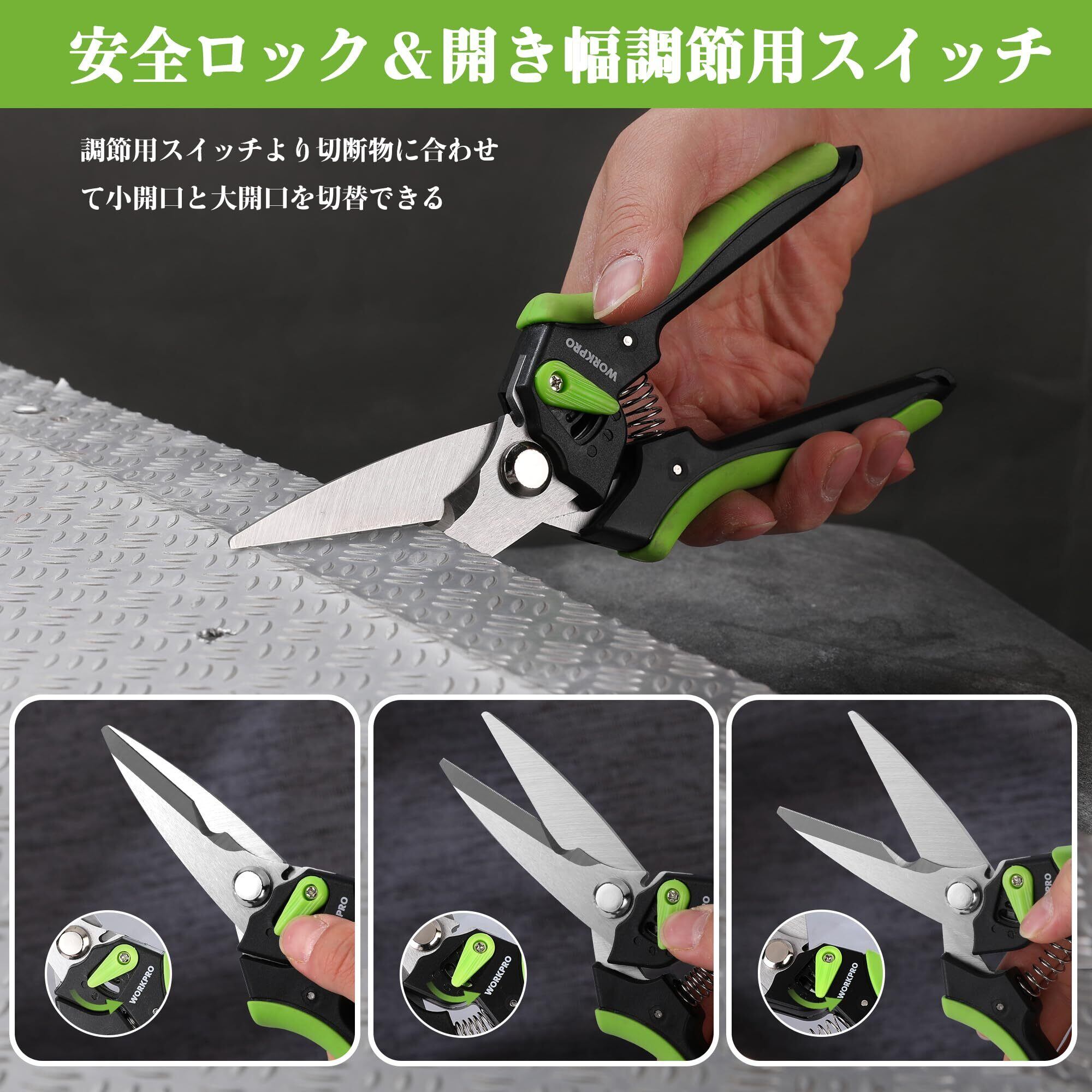WORKPRO 万能ハサミ 強力はさみ 多目的切断工具 ステンレス鋼製刃 グリップ開き調整可能 左右利きロック設計 厚紙 段ボール 針金 ワイヤー 粗大ゴミ解体 園芸 大工用 家庭用 作業用