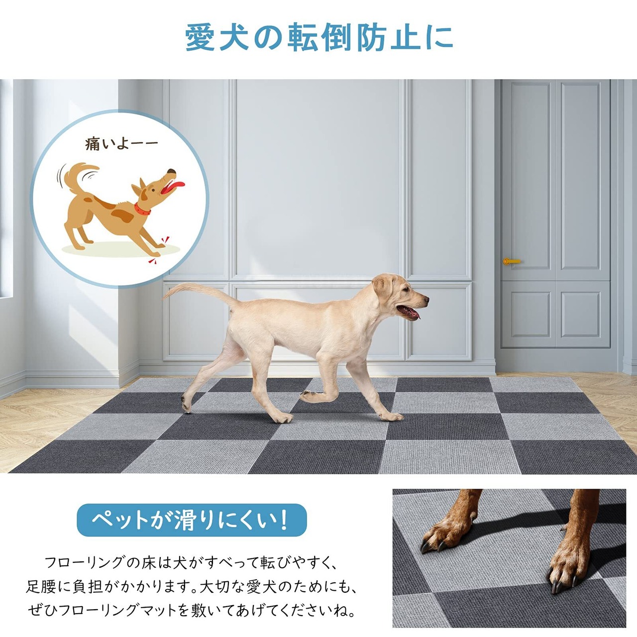 【ずれない 吸着タイルカーペット】空気が抜け真空状態になって無数の吸盤ができたようなくっつく仕組みだから、動き回ってもマットはズレません。厚み約4mmのマットですので、つまずきにくく、扉の開閉の妨げにもなりません。引っ掛かったりする恐れが少なくなる。高齢者や老犬は足腰が弱くなり、滑り止め対策として良いものです。