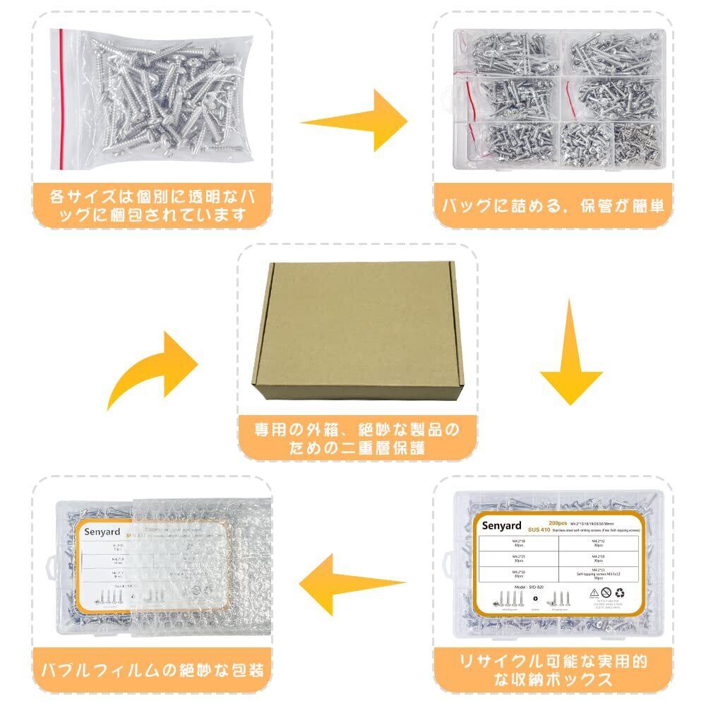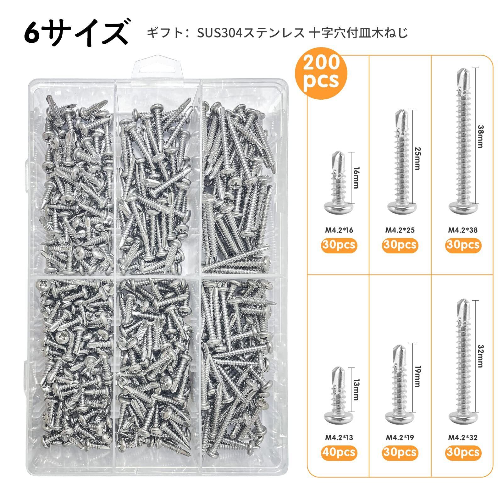 【ドリルネジ セット 混合サイズ】:ドリルネジセットに高品質のSUS 410ステンレス鋼で作られています。,合計200pcs。木ネジ3.5mm*12mm付き,6サイズのドリルねじ:4.2mm*13mm/16mm/19mm/25mm/32mm/38mm。