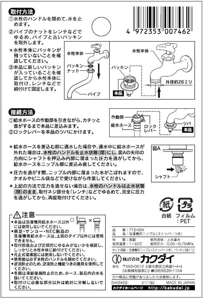 カクダイ(KAKUDAI) 洗濯機用 取替簡単ニップル 呼13 自在水栓 対応 給水ホースをワンタッチ接続 水漏れ防止ストッパー付き 金属製 772-004