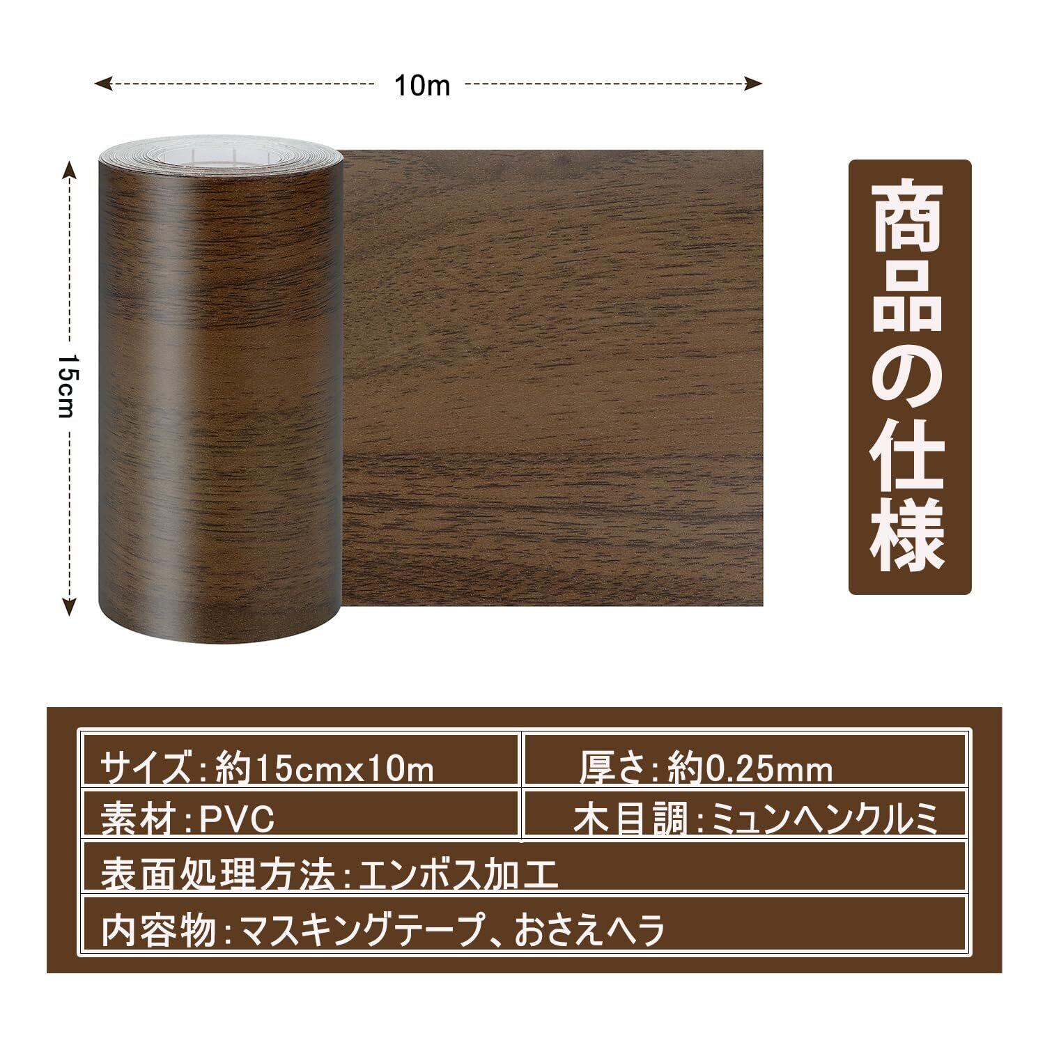 【仕様】サイズ:約15cmx10m 厚さ:約0.25mm 素材:PVC 表面処理方法:エンボス加工 木目調:ミュンヘンクルミ 内容物:マスキングテープ、おさえヘラ