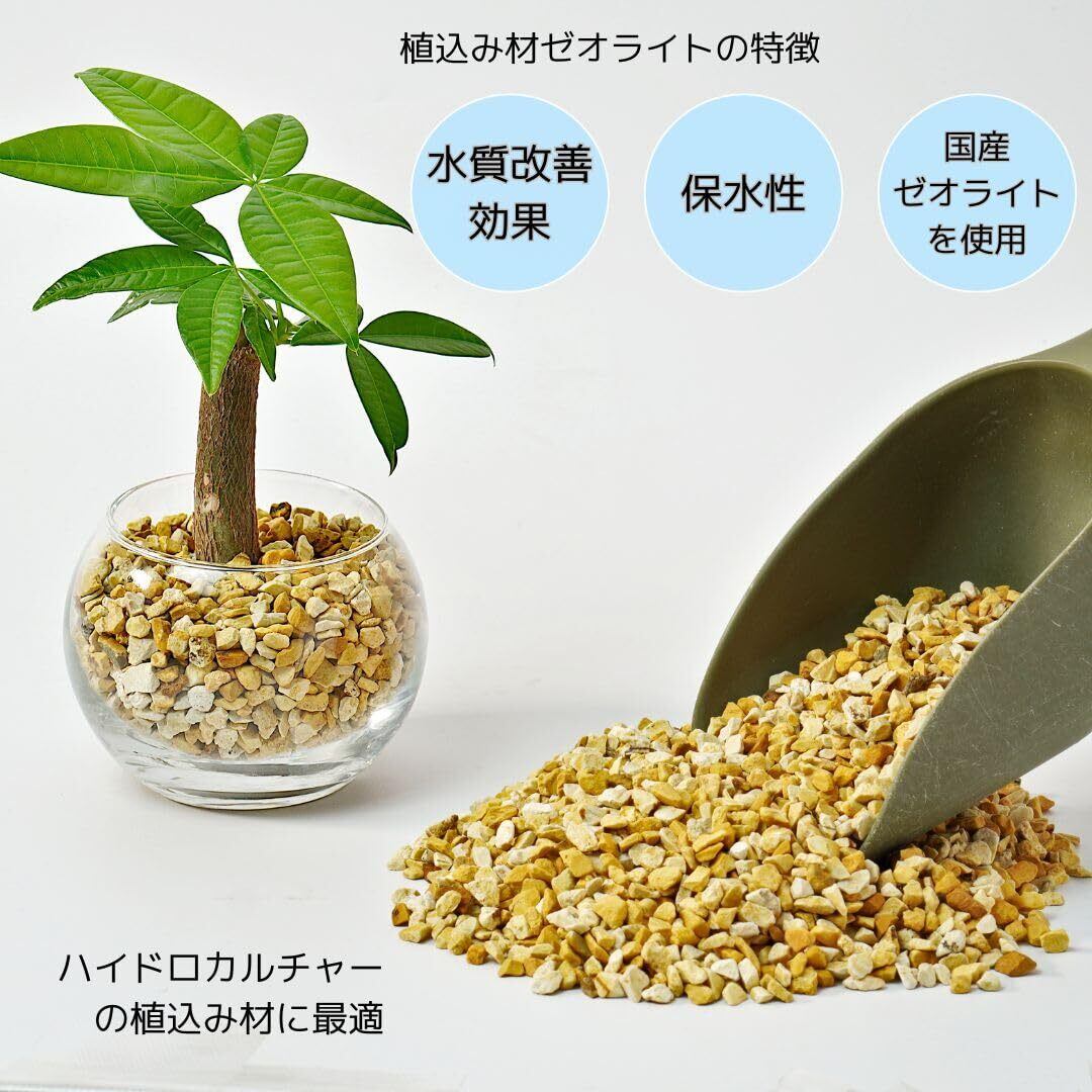 ゼオライトは何百年もの昔、火山活動によって噴出した火山灰が海底や湖底に堆積し、長い年月をかけ地下深い所で固まってできた鉱物です。 見た目も美しく吸水性の良い特徴はハイドロカルチャーの植え込み材としても適しています。 また、ゼオライト特有の微細な多孔質構造は有害物質を吸着する為、水を浄化し雑菌の繁殖や腐敗を防ぐ効果もあります。