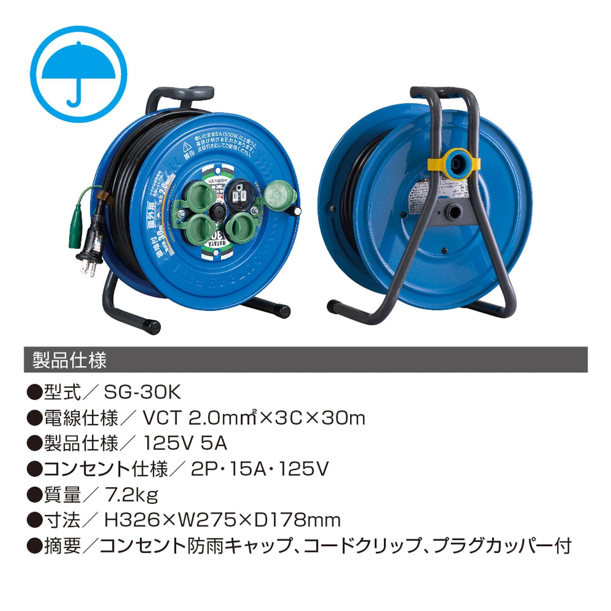 ハタヤ (HATAYA) コードリール 屋外用 (防雨型) 100V型 コード30m 太さ2.0㎟ 標準型 接地付 コンセント4個 コンセント防雨キャップ プラグカッパー1個付属 家庭用 工場用 建設現場 サンデーレインボーリール SG-30K