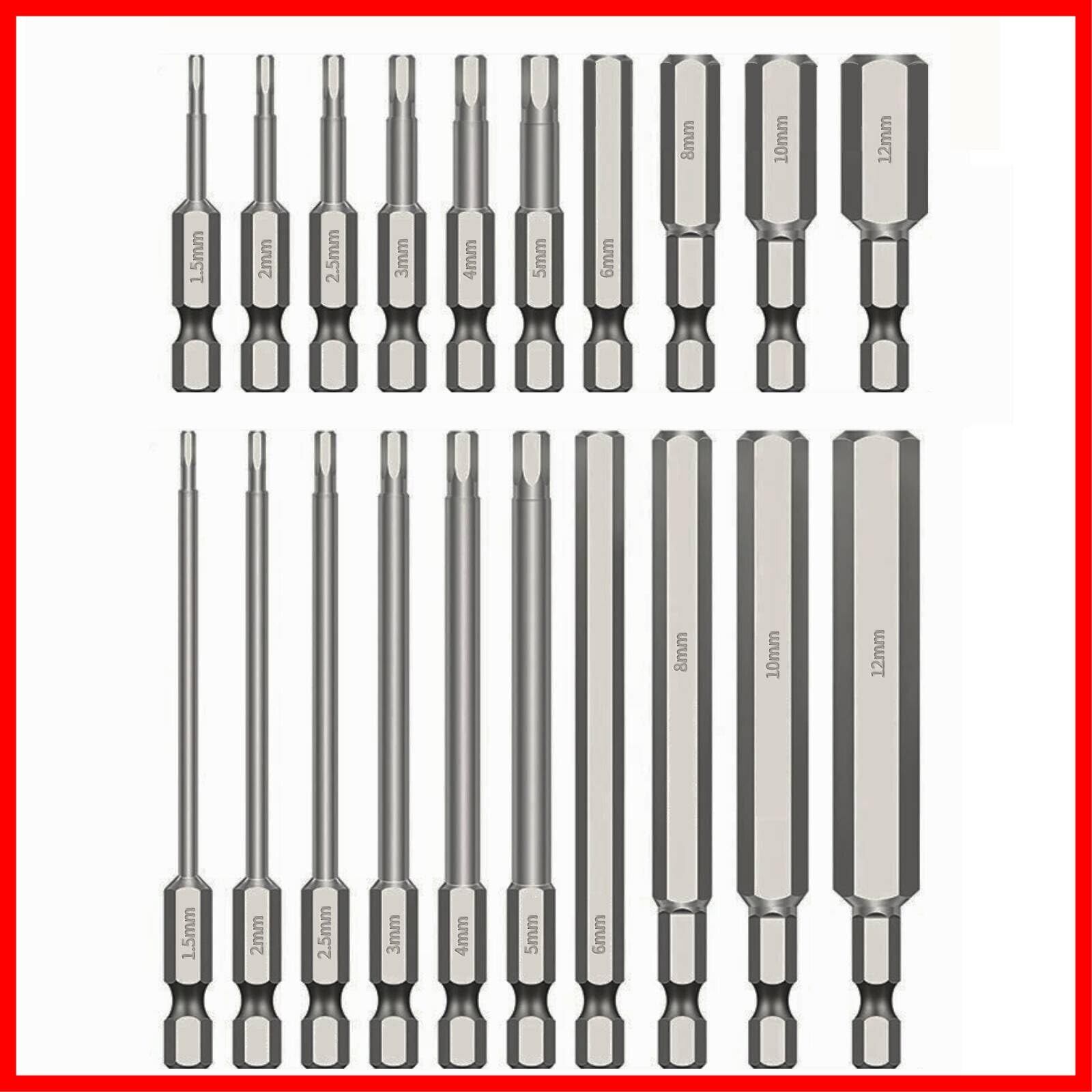 【50mmと100mm六角ビットセット】長さ50mm:六角ビット*10本、サイズ-1.5mm、2.0mm、2.5mm、3.0mm、4.0mm、5.0mm、6.0mm、8.0mm、10mm、12mm。 長さ100mm:六角ビット*10本、サイズ-1.5mm、2.0mm、2.5mm、3.0mm、4.0mm、5.0mm、6.0mm、8.0mm、10mm、12mm。