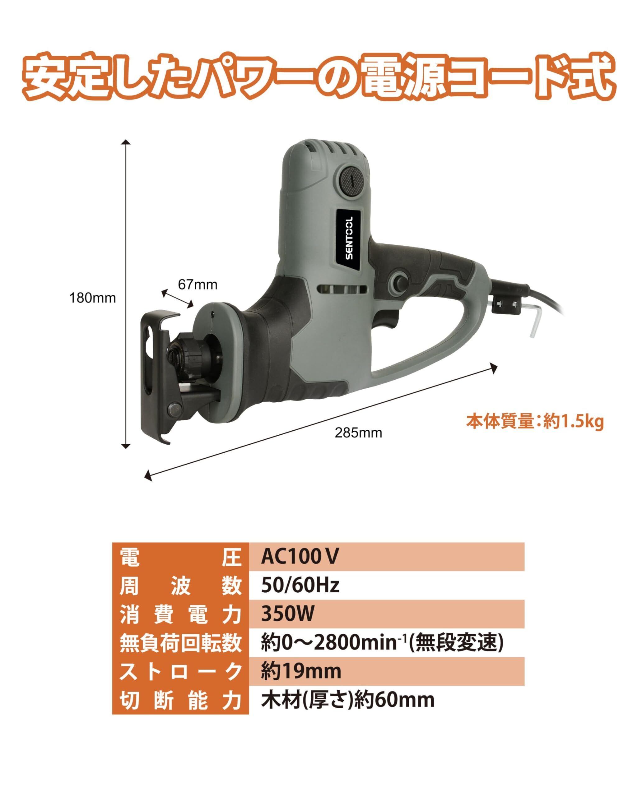 SENTOOL 電動ノコギリ AC100V 電気のこぎり 電源コード式 レシプロソー 350W【木材から軟鋼材の切断、粗大ごみ解体、庭木の剪定が出来るマルチユースの万能ノコギリ】電動のこぎり 切断能力 木材60mm 3種ブレード付属 TDN400