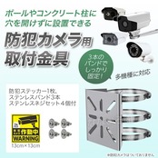 防犯カメラをポールやコンクリート柱に穴を開けずに設置できるブラケット(取付金具)です。 防犯ステッカー1枚(屋外用、日本製、13cm×13cm)、ステンレスバンド3本、ステンレスネジセット4個付きです。