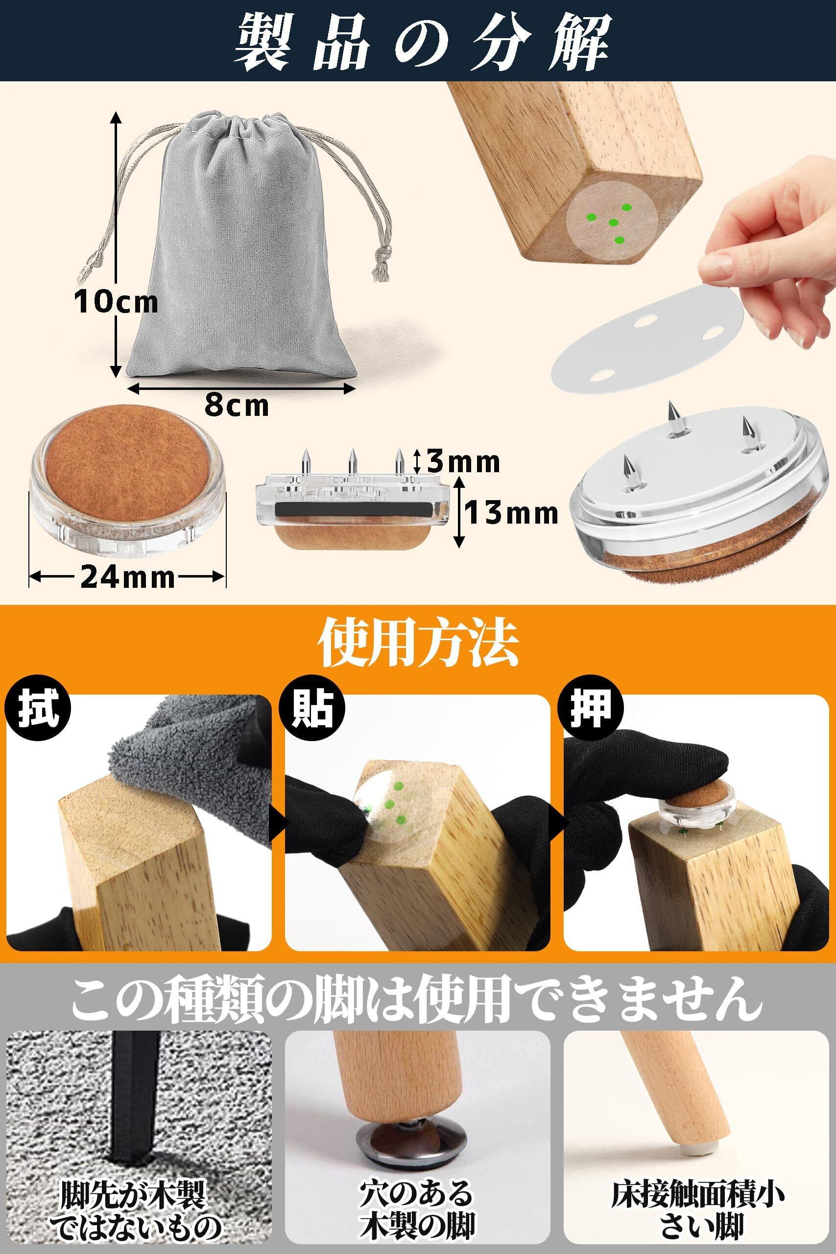 【椅子脚カバーの新設計】3つのアンカー(約3mmの突出部分)が特殊設計で、椅子の足にしっかり噛みつき、脱落や移動を防ぎます。強力な粘着テープを使用し、普通の両面テープの4倍の強度で固定。長時間使用しても安定性が高く、常に牢固に固定できます。工具不要で簡単に取り付け・取り外しができるため、誰でも簡単に使えます。ソファ、ベッド、ダイニングチェアなどにも対応。傷防止、滑り止め、家具保護に最適な椅子脚カバーです。