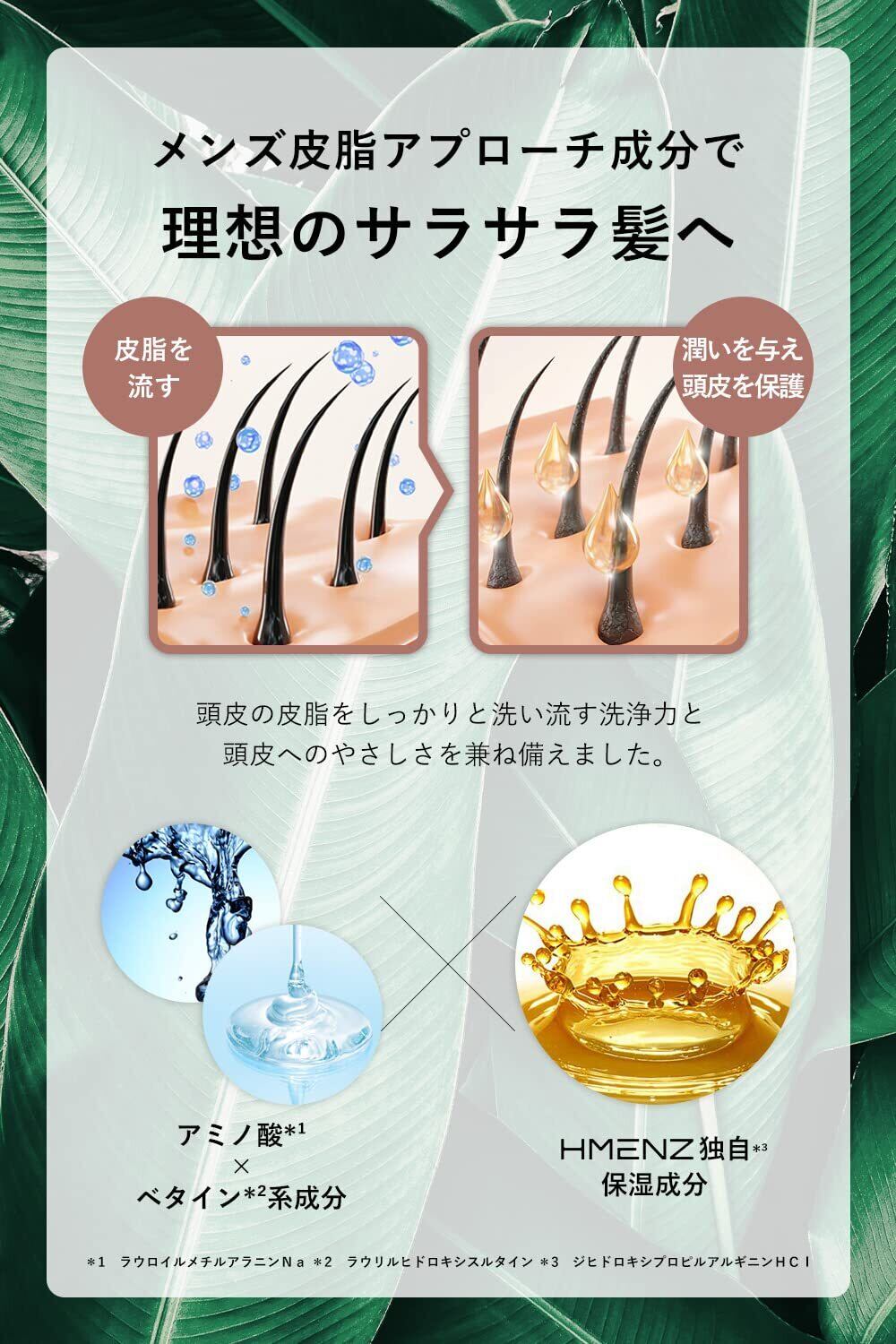 【メンズ皮脂に特化】アミノ酸*¹×ベタイン*²系成分で皮脂をしっかり洗い流しながら、保湿成分*³が頭皮を潤し保護!頭皮への優しさを兼ね備え理想のサラサラ髪へ導きます。(*¹ラウロイルメチルアラニンNa、*²ラウリルヒドロキシスルタイン、*³ジヒドロキシプロピルアルギニンHCl)