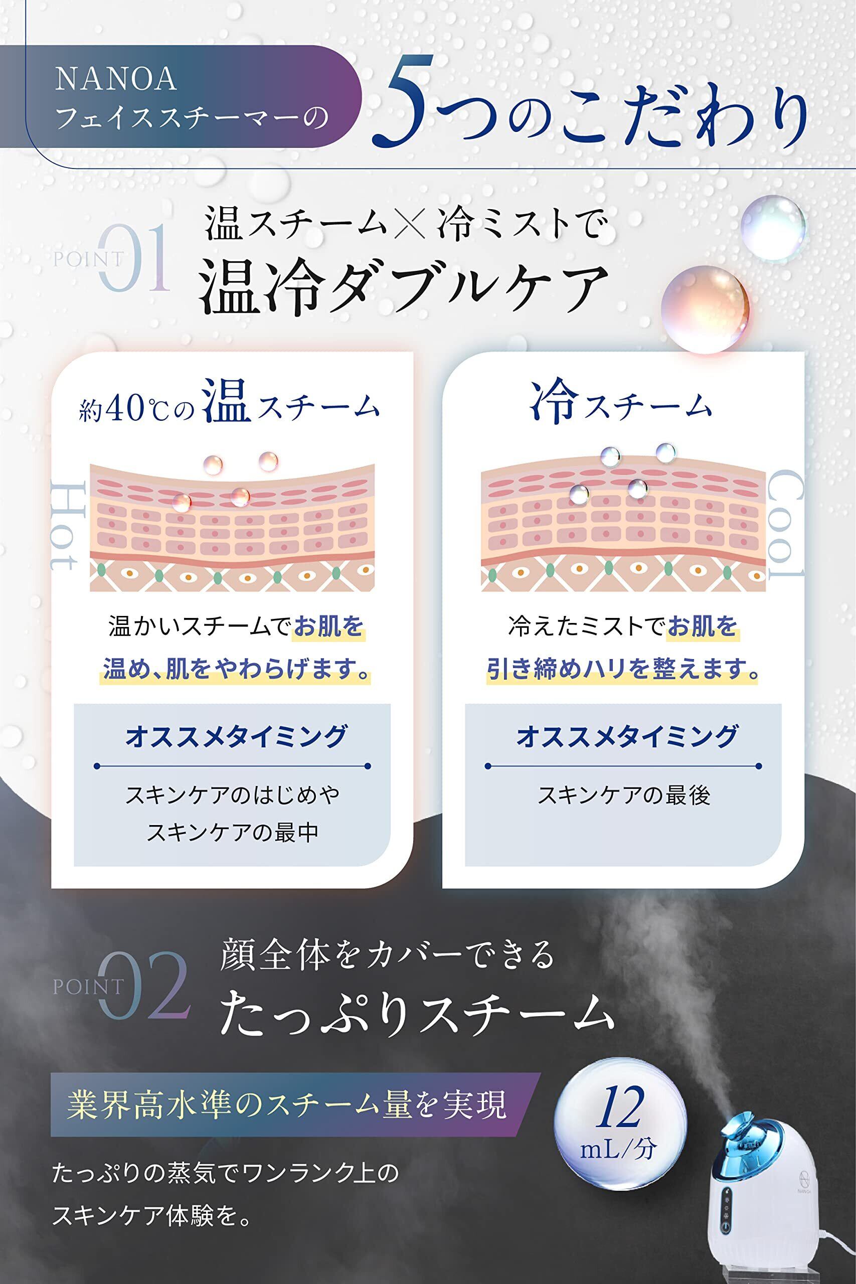 【温スチーム×冷ミストで温冷ダブルケア】温かいスチームで肌をやわらげ、最後に冷ミストで肌を引き締めることができます。【たっぷりスチーム】毎分12mLの業界高水準のスチーム量を実現。たっぷり蒸気でお顔全体をしっかり保湿します。
