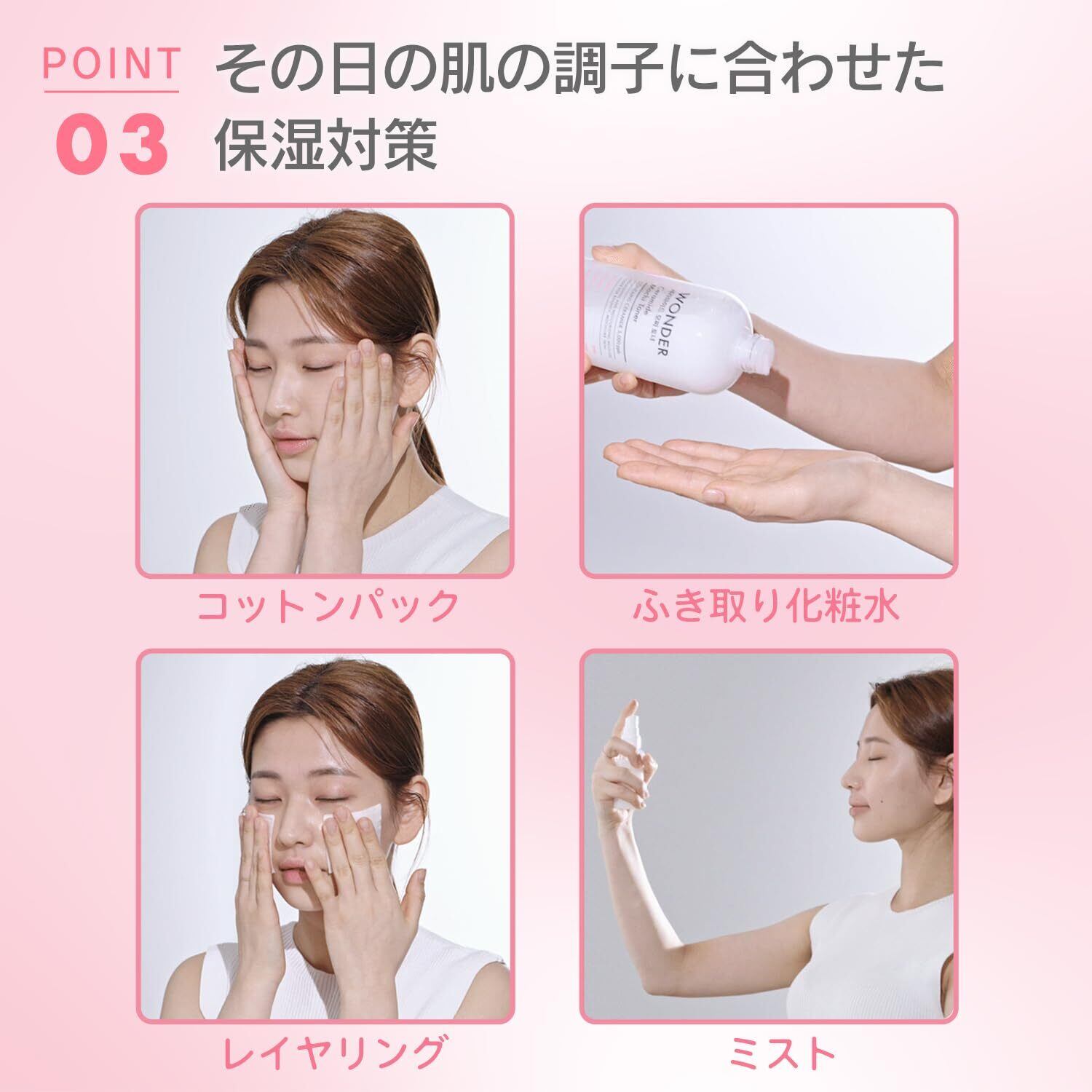 【その日の調子に合わせた4つの保湿対策】モチトナー はその日の肌の調子に合わせ4つの方法で保湿対策が可能です。(コットンパック、拭き取り化粧水、レイヤリング、ミスト)