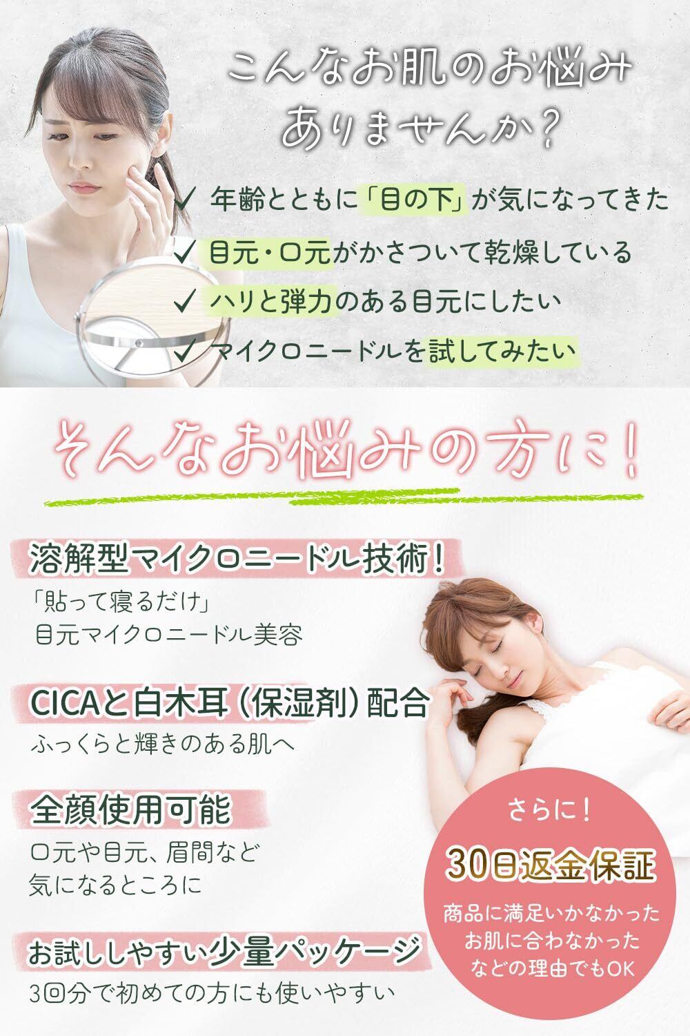 【全顔使用可能・寝る前に貼るだけ】寝る前にお悩み部分に貼って(目元、口元、眉間など全顔に使用可能)、翌日剥がすだけ、「美」はおはようから。寝ている間に剥がれても安心です、針自体は約30分で溶け、浸透*しますので、心配いりません。無添加成分で、女性だけではなくて男性にもおすすめです。※1週間に1回を目安にお使いください。*角質層まで