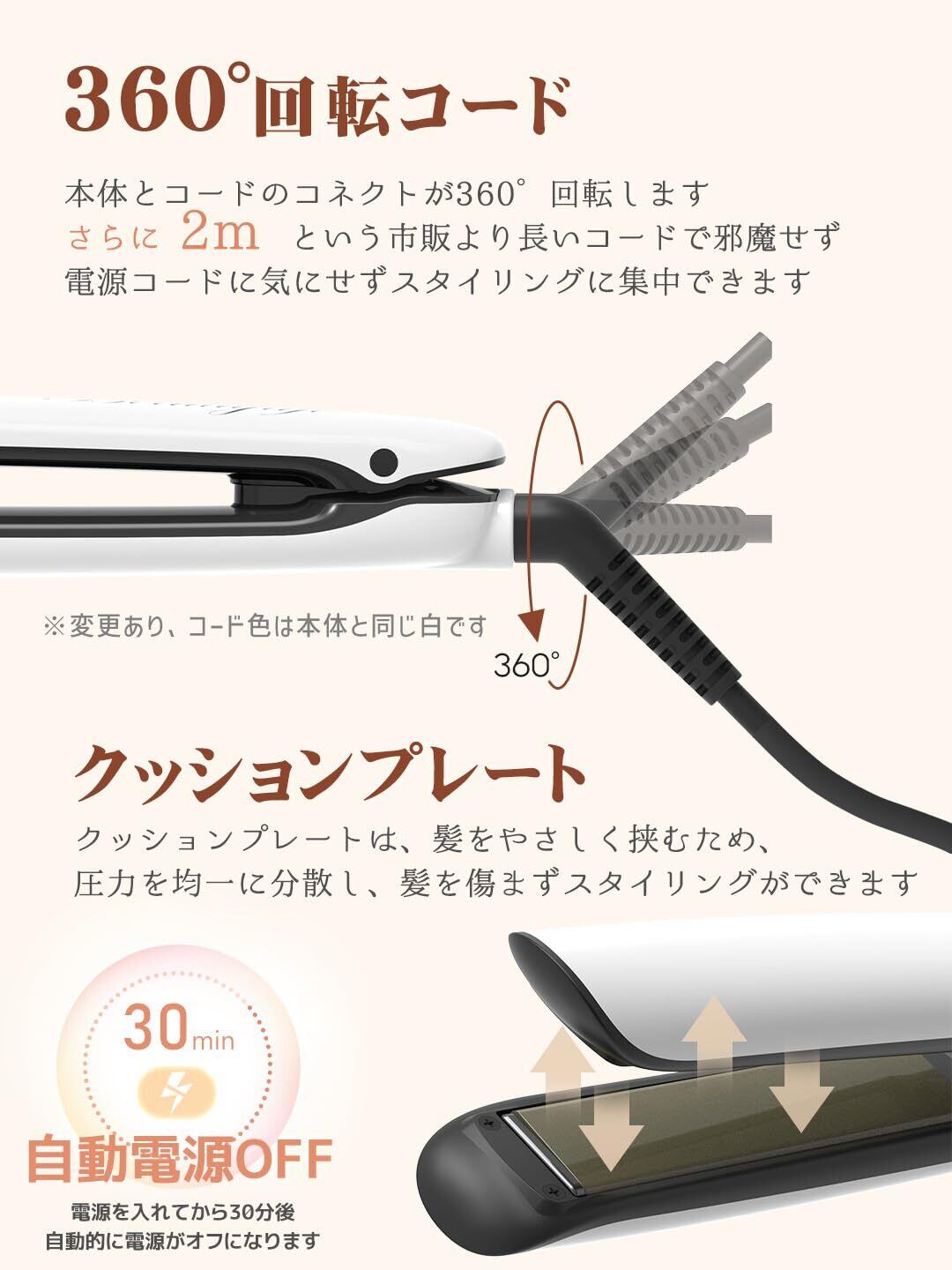【回転式の電源コード・自動電源OFF付き2way ヘアアイロン】スタイリングの邪魔をしない長さ約2mのコード。接続部分が360度回転するため、ねじれにくく絡まりにくい構造です。起動から約30分経過すると自動で電源がオフに。つけっぱなしによる火事や事故を防止します。