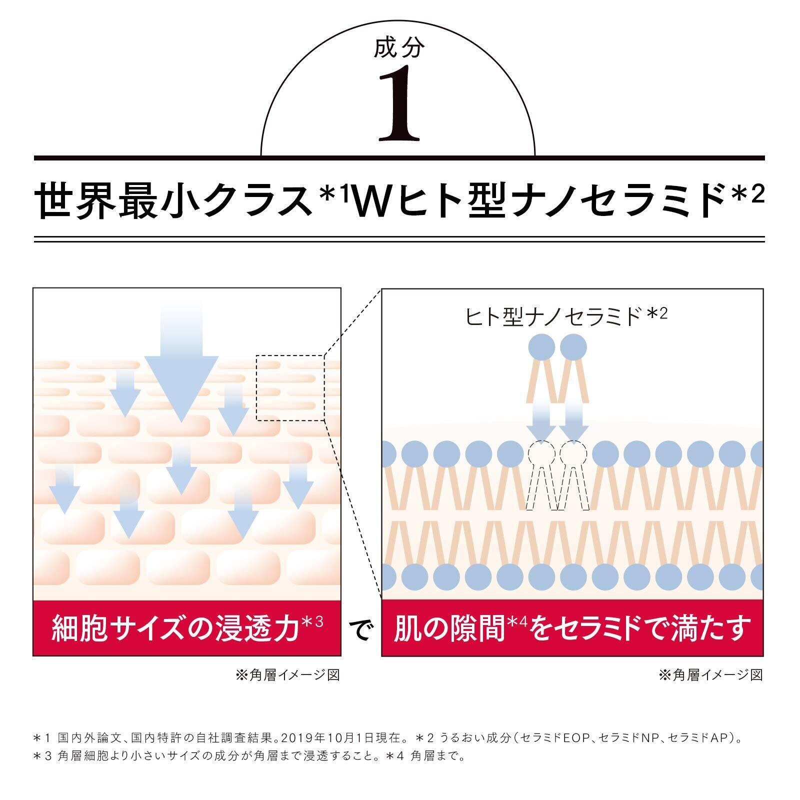 【主な成分1 うるおいを保つWヒト型ナノセラミド*1】ハリやうるおいに満ちた肌を保つには、土台*2となるセラミドのケアが大事。 独自のナノテクノロジーでセラミドを極小化することで、高浸透*3を実現。 【注釈】*1 うるおい成分(セラミドEOP、セラミドNP、セラミドAP) *2 しっかりとしたお手入れという意味 *3 角層まで。当社比 【ご使用方法】①適量パール粒大を手に取り、手のひらでジェリーを軽く伸ばす。②手のひらで顔全体をあたためるように包み込み、ジェリーを肌になじませる。