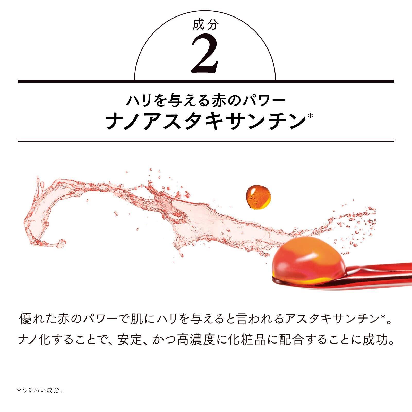 【ハリを与える赤のパワー ナノアスタキサンチン*4】優れた赤のパワーで肌にハリを与えると言われるアスタキサンチン*4。ナノ化することで、安定、かつ高濃度に化粧品に配合することに成功。【注釈】*4 うるおい成分