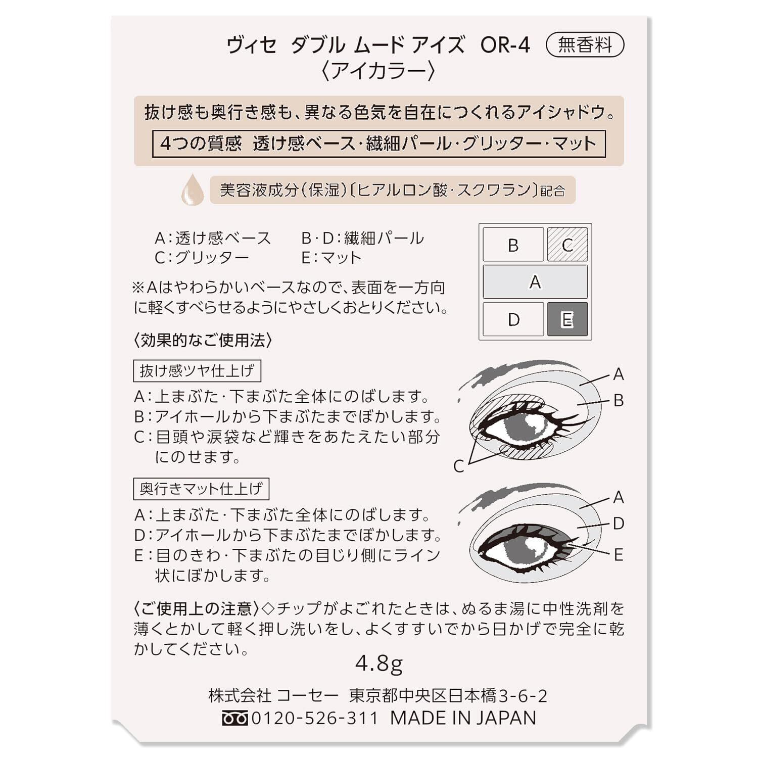 効果的なご使用法 (抜け感ツヤ仕上げ) : A 上まぶた・下まぶた全体にのばします。B アイホールから下まぶたまでぼかします。C 目頭や涙袋など輝きをあたえたい部分にのせます。 (奥行きマット仕上げ) A 上まぶた・下まぶた全体にのばします。D アイホールから下まぶたまでぼかします。E 目のきわ・下まぶたの目じり側にライン状にぼかします。