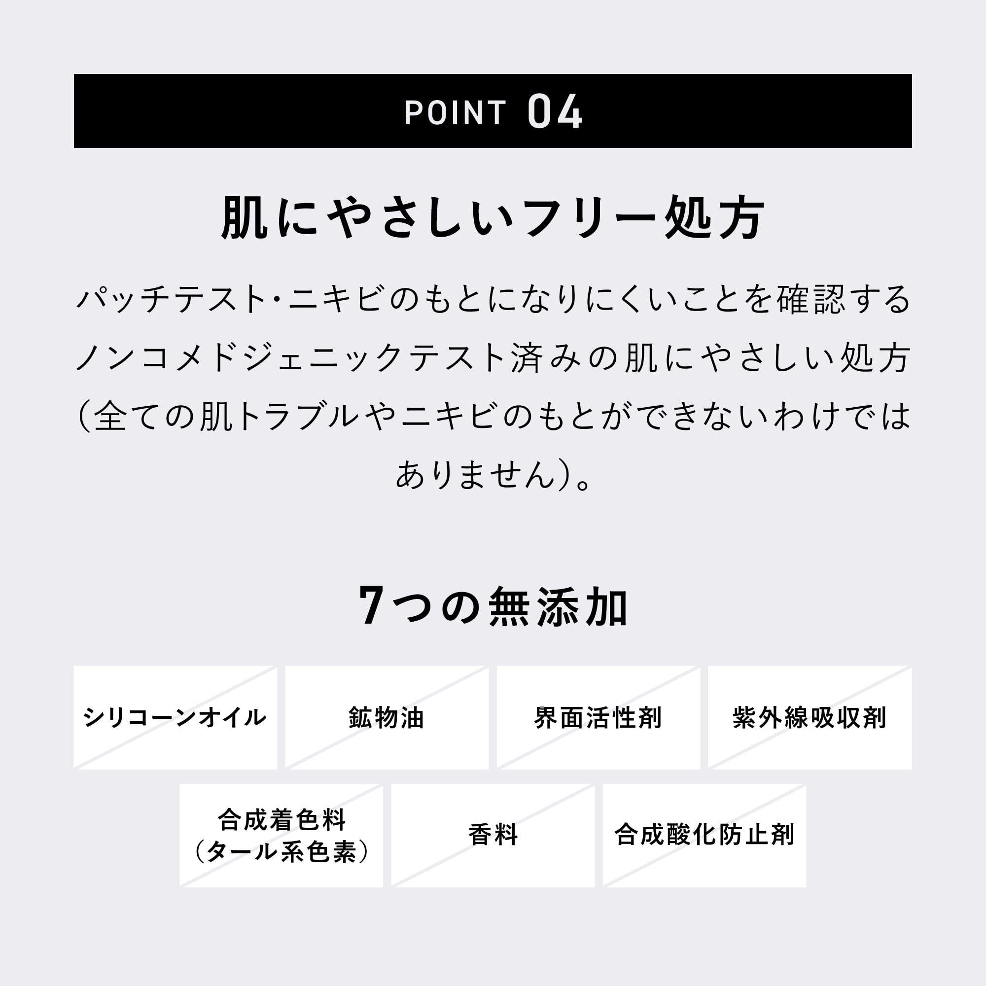 8つの無添加:シリコーンオイル、鉱物油、界面活性剤、紫外線吸収剤、タール系色素、合成香料、合成酸化防止剤、旧表示指定成分