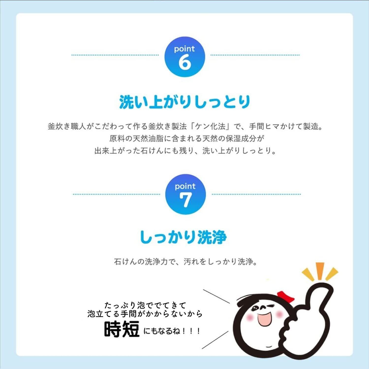 頭・顔・体・足の全身を洗える無添加石けん。適度な洗浄力で、しっとりと洗い上げます。