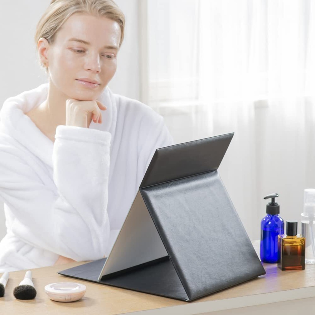 【軽量コンパクト・角度調整可能】お好きな角度でメイクが出来るように角度調整可能なロックラインが付いています。また、ミラーの裏面には滑り止め防止のクッションゴムも付いています。収納時は軽量でコンパクトなので、引き出しやバッグに入れても邪魔になりません。旅行やお出かけ時など持ち運びに便利です。カバーはクッション素材でバッグに入れても割れにくくなっています。サイズ25.5cm×32cm、厚み1.5cm、重量約695g