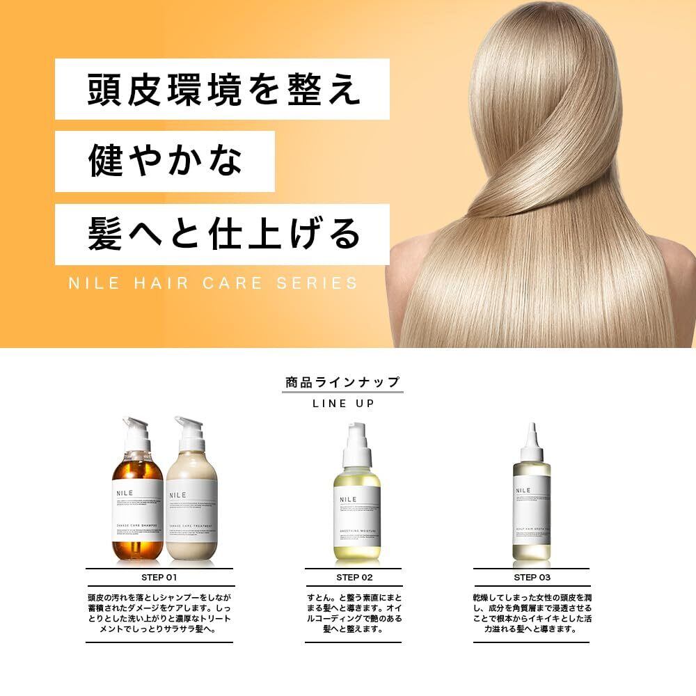 【おすすめの髪質】細く、柔らかい髪のメンズ・レディース。サラサラ・しっとり・エアリーに仕上げたい。スタイリング前のサラサラするベースヘアを作りたい。 【エアリーな仕上がり】軽いテクスチャで髪に馴染みのいいオリジナルテクスチャ。馴染ませ乾かしたあとはフワサラの感動の指通りを体験していただけます。 【椿オイルで自然な艶髪へ】椿種子から抽出できるオイルをメイン成分として配合。髪馴染みが非常によく、サラサラに仕上げ、まとまり髪へと導きまます。 【新感覚の香るヘアオイル】NILE伝統のリラックスを導く香りで、スタイリングや髪質改善だけでなく、香りも楽しむ新感覚のヘアフレグランスオイルです。 【ご使用方法】タオルドライ後、1プッシュを基準に毛量に合わせてアウトバストリートメントとしてご使用ください。手のひら、指の間で馴染ませ頭皮につかないよう馴染ませドライヤーで乾かしてください。