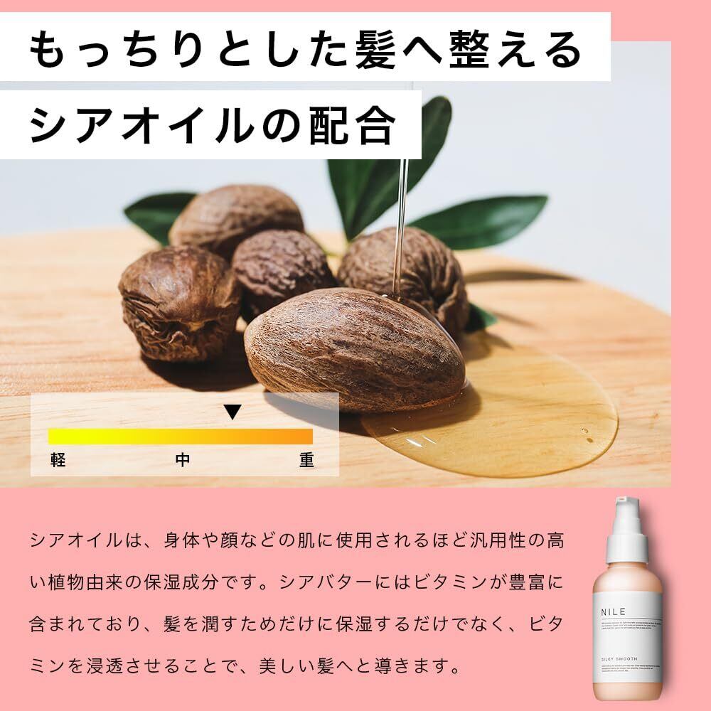 【おすすめの髪質】細く、柔らかい髪のメンズ・レディース。サラサラ・しっとり・エアリーに仕上げたい。スタイリング前のサラサラするベースヘアを作りたい。 【エアリーな仕上がり】軽いテクスチャで髪に馴染みのいいオリジナルテクスチャ。馴染ませ乾かしたあとはフワサラの感動の指通りを体験していただけます。 【椿オイルで自然な艶髪へ】椿種子から抽出できるオイルをメイン成分として配合。髪馴染みが非常によく、サラサラに仕上げ、まとまり髪へと導きまます。 【新感覚の香るヘアオイル】NILE伝統のリラックスを導く香りで、スタイリングや髪質改善だけでなく、香りも楽しむ新感覚のヘアフレグランスオイルです。 【ご使用方法】タオルドライ後、1プッシュを基準に毛量に合わせてアウトバストリートメントとしてご使用ください。手のひら、指の間で馴染ませ頭皮につかないよう馴染ませドライヤーで乾かしてください。