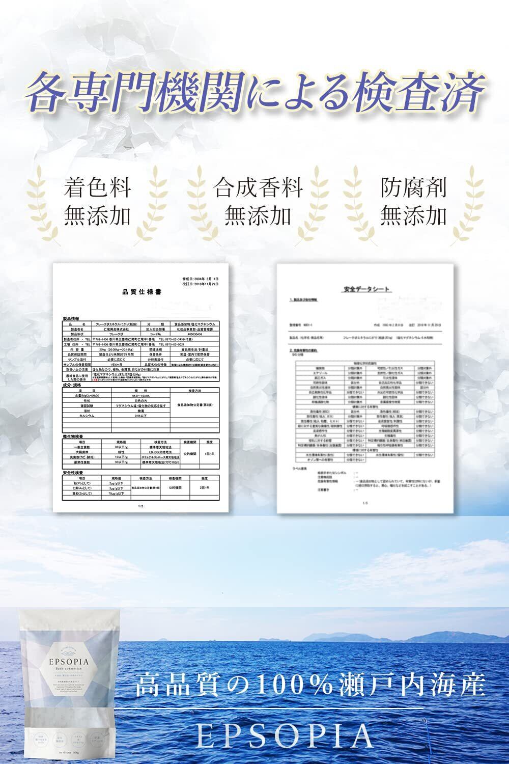 【ご使用方法】入浴時に浴槽へ付属のスプーン1杯を入れてください。(約13g)(冬場などの乾燥時期や保湿・保温を高めたい場合には3~5杯ほどお入れください。)よく混ぜて溶かします。ナトリウムを99.5%以上除去しておりますので、追い焚き循環式や24時間風呂でも使用できます。残り湯を洗濯にもお使い頂けます。国産100%エプソピアは瀬戸内海に面した製塩工場で製造されています。