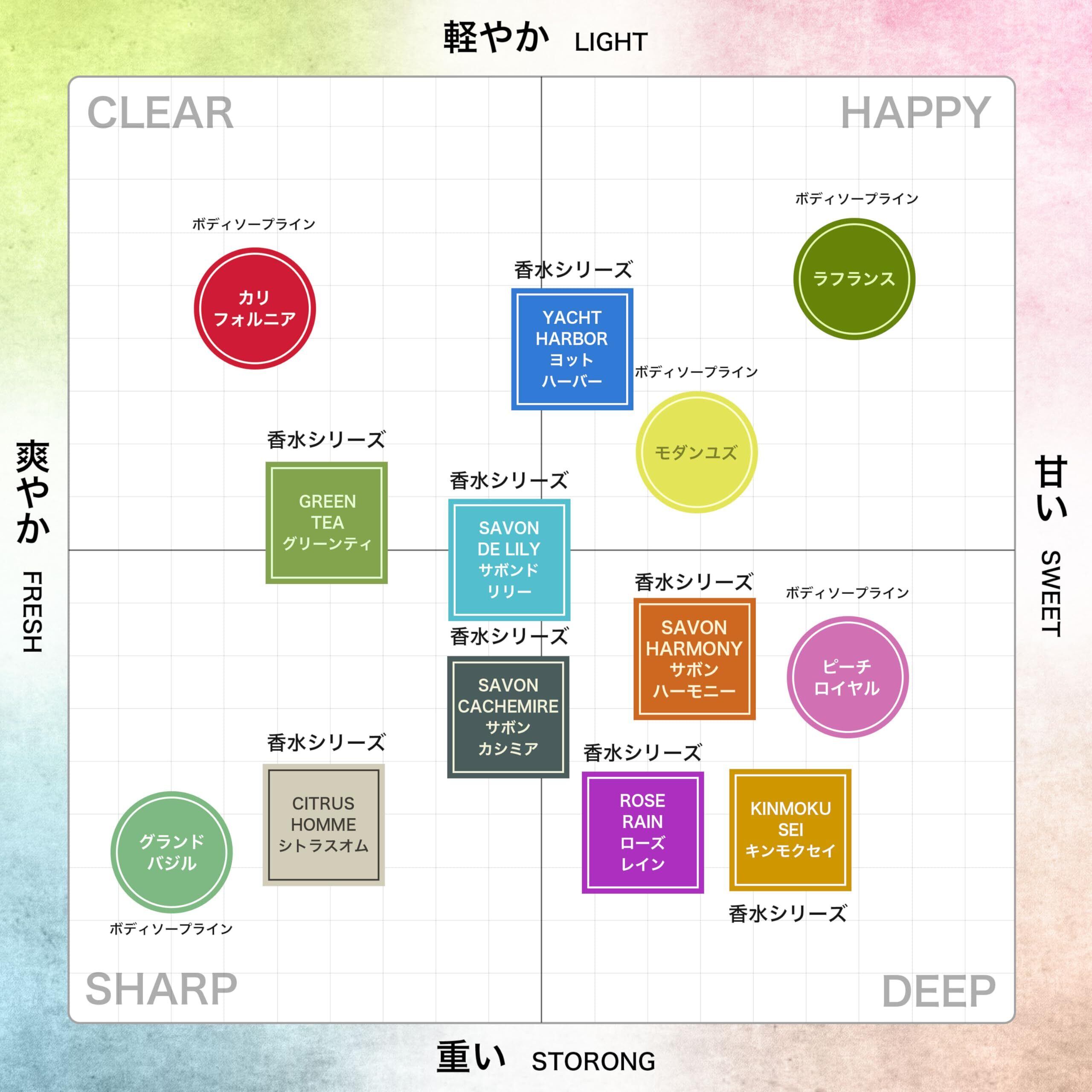【フレッシュな酸味と仄かな苦味が調和するビターシトラス】広大なグレープフルーツ果樹園を彷彿とさせる、みずみずしいシトラスフルーティーノート。ジューシーで爽やかなグレープフルーツとオレンジやベルガモットなどが爽冷な印象を与え、至高の清潔感をもたらします。果汁の酸味や果皮の苦味も溶け合い構築されたシトラス調は、フレッシュで木々の温かみを漂わせ、カリフォルニアで過ごすバカンスの情景をお届けします。