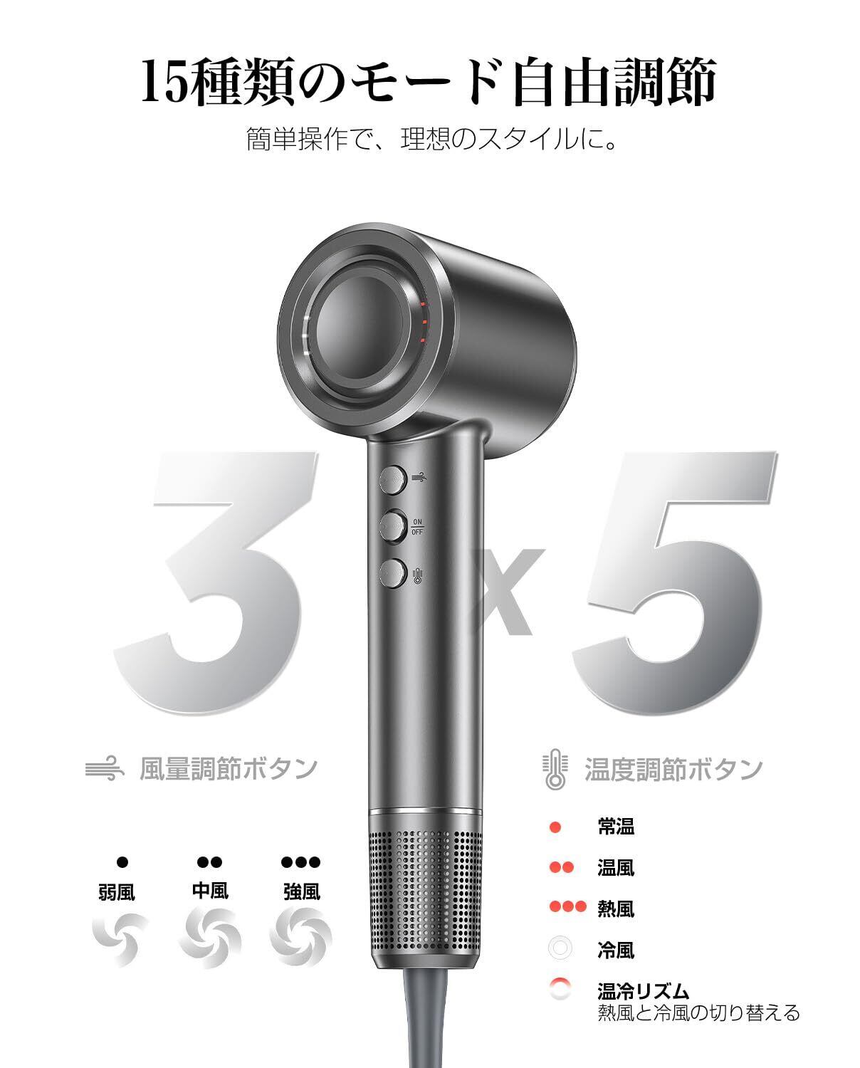️【3段階風量調節&5段階温度調節で、髪に最適なケアを実現】強・中・弱の3段階風量と、冷風・常温・温風・熱風・温冷リズム5段階の温度調節を搭載。さらに、温冷リズムモードで頭皮の健康をサポートし、髪質やスタイルに合わせた最適な設定が可能です。どんなシーンでも、プロのような仕上がりを簡単に叶えます。「温冷リズムモード:3秒長押し冷温熱風交替,赤色灯交替点滅」