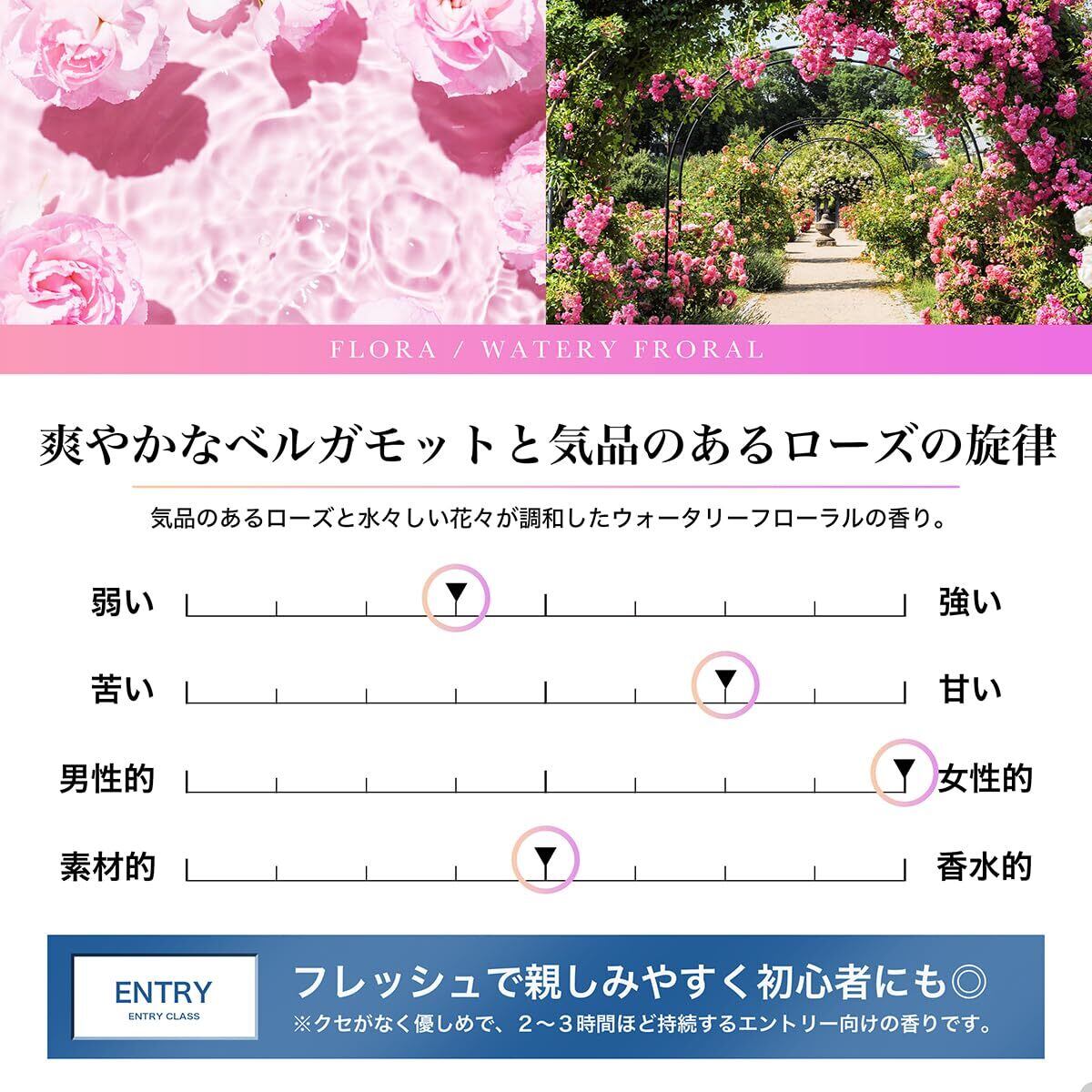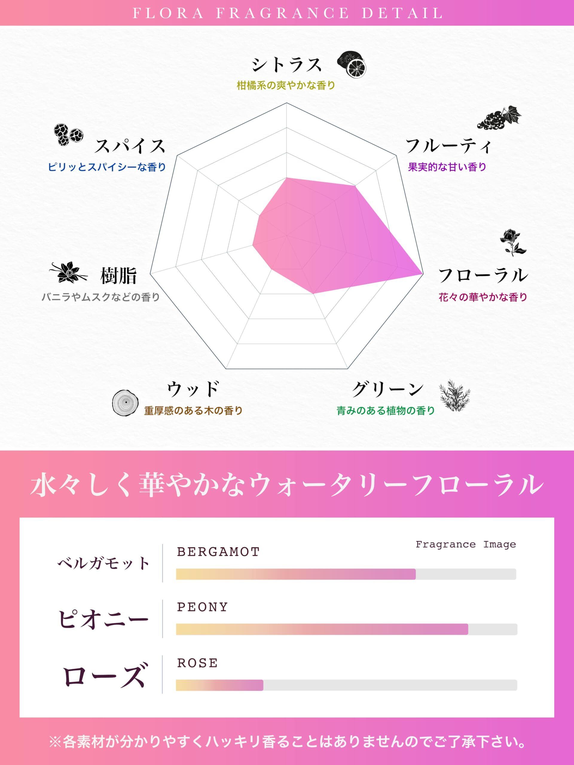 【花束に包まれるような気品溢れる香り】世界中の美しい花々をブーケに包み込んだ水々しいウォータリーフローラルノート。ベルガモットが爽やかさを放ち、鮮やかなピオニーやローズの華やかな甘さが上品な女性らしさをもたらします。澄み渡る水と花々のエッセンスが溶け合い、濃厚なブーケを妖精がひらりと舞うようにフレッシュで華麗な芳香を放ちます。