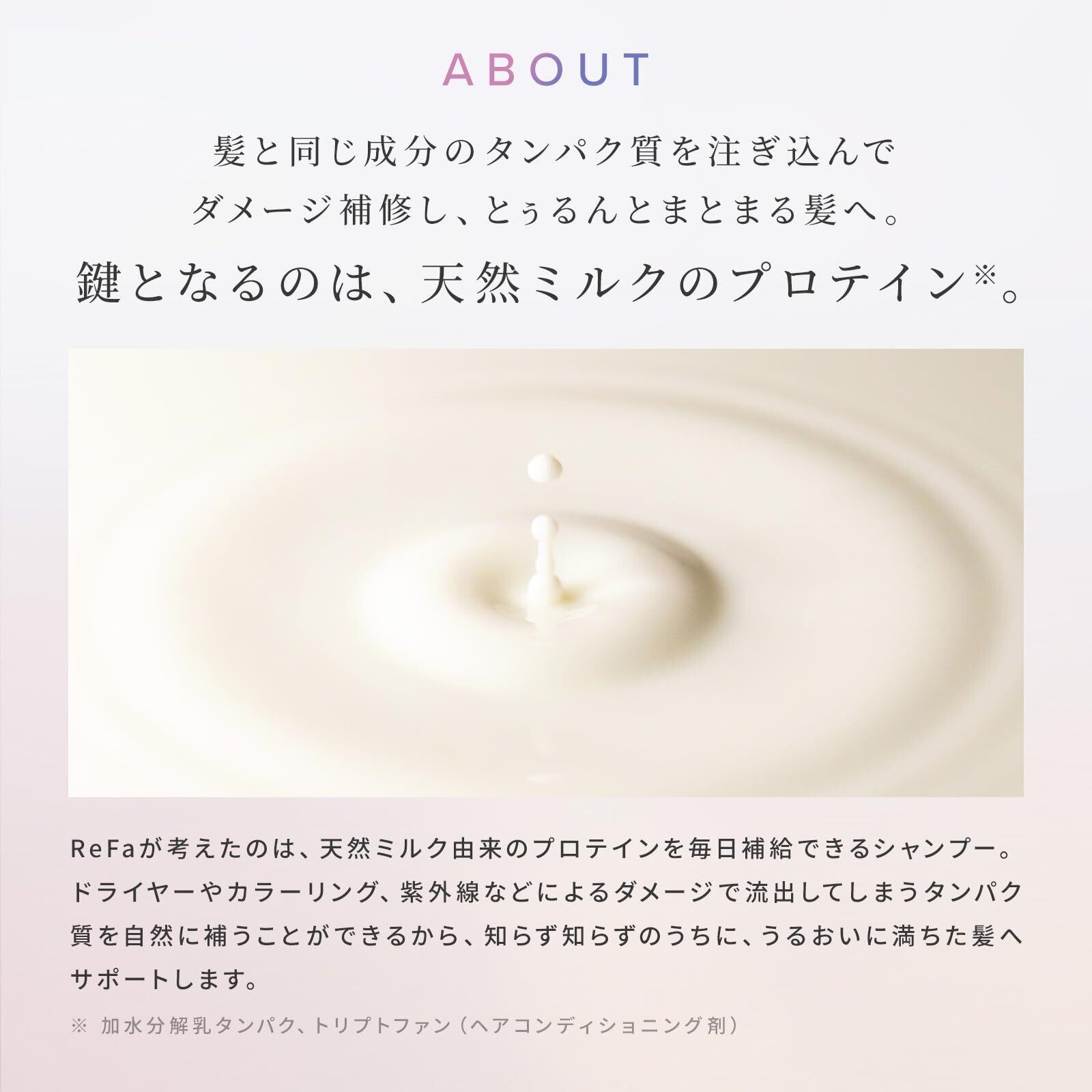 ReFaが着目したのは、私たちの髪の80%がタンパク質という事実。ヘアケアというと"保湿(水分ケア)"に目が行きがちですが、毎日のヘアダメージで失われている成分のほとんどは、実はタンパク質なのです。そこで今回、ReFa MILK PROTEINヘアケアラインの全ラインナップに、毛髪との親和性が高い天然ミルク由来のプロテイン※1とホワイトスムースコンプレックス※2を配合。毎日のヘアケアによるたっぷりのプロテイン※1補給で、※1 加水分解乳タンパク、トリプトファン(ヘアコンディショニング剤)※2 ラウルジモニウムヒドロキシプロピル加水分解ケラチン(羊毛)、セテアラミドエチルジエトニウム加水分解コメタンパク、シア脂、真珠母貝エキス、(ジヒドロキシメチルシリルプロポキシ)ヒドロキシプロピル加水分解シルク、ヒドロキシプロピルトリモニウム加水分解ダイズタンパク(保湿剤)「とぅるん」とまとまる、なめらかな指どおりの髪へと導きます。