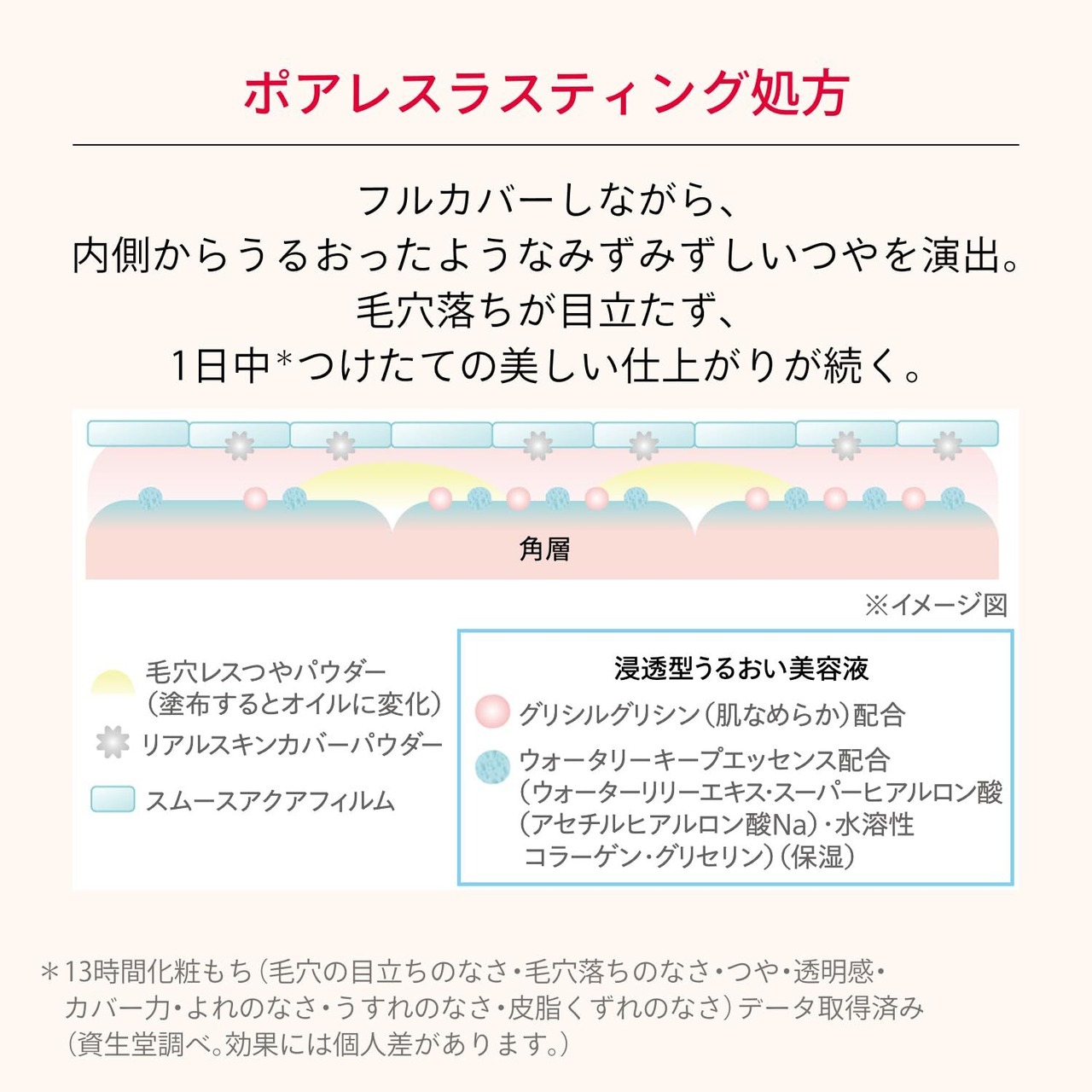 美容液でメイクする新発想で、使うたび、毛穴レスな「極上つるん肌」へ。 美容液でファンデ成分を包みこみ美容液が肌にずっとふれる独自技術「セラムファースト技術」を搭載した、ファンデ美容液。 毛穴や角層の奥までうるおいが届き、なめらかな肌へ。 毛穴・色ムラをしっかりカバーするのにみずみずしい使い心地。 毛穴落ちが目立たず、1日中*つけたての美しい仕上がりが持続。 *13時間 化粧もち**データ取得済み **毛穴の目立ちのなさ・毛穴落ちのなさ・つや・透明感・カバー力・よれのなさ・うすれのなさ・皮脂崩れのなさ (メーカー調べ。効果には個人差があります。)