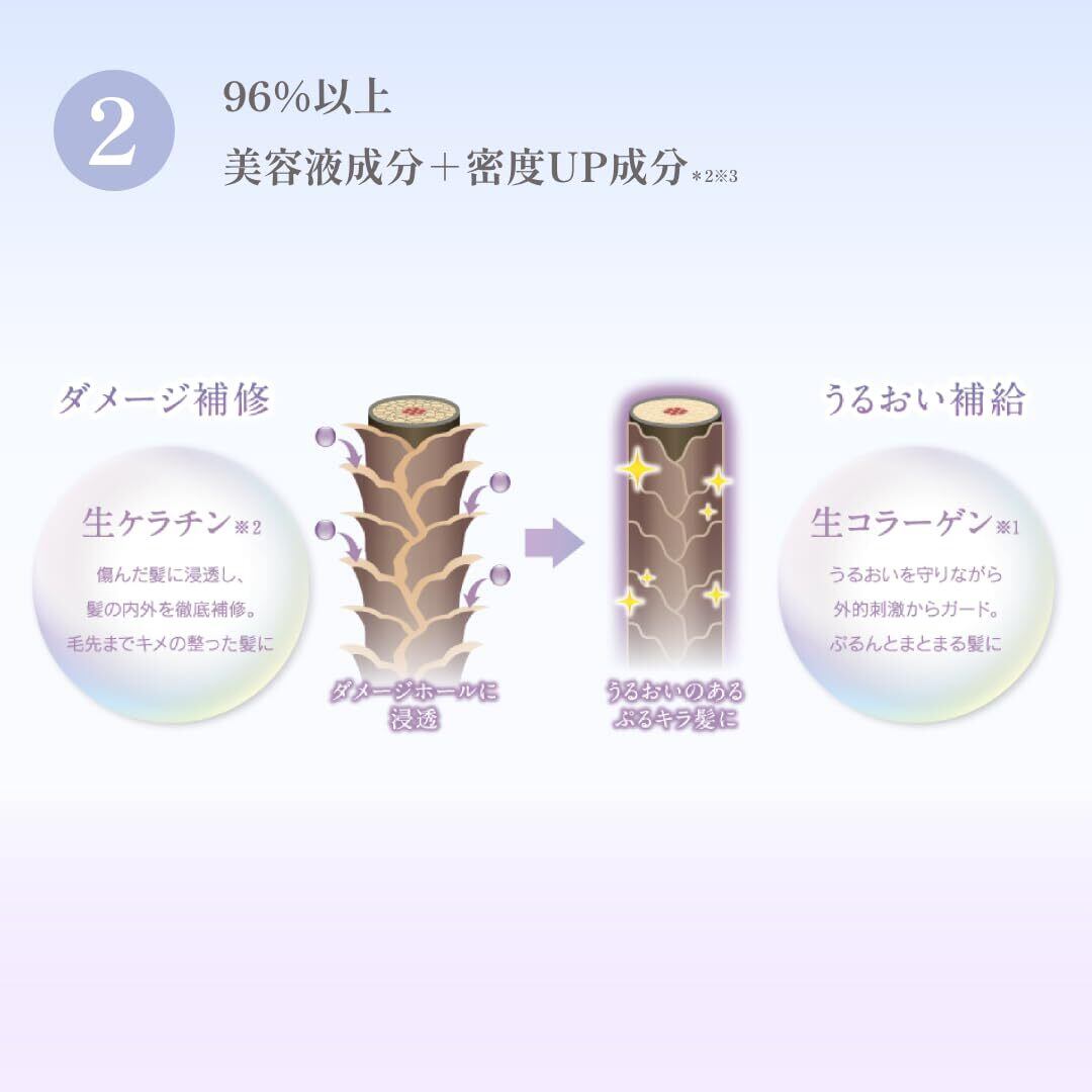 《 97%以上*美容液成分 》独自の調合でつくられた髪と地肌をうるおす「美容液成分」と水分蒸発を防ぐ「浸透オイル」を独自のバランスで調合し、滑らかな使い心地とうるおい感を与えます。(*6種の浸透保湿成分 カムカムエキス/ツボクサエキス/プラセンタエキス/ビタミンC誘導体/ビタミンA誘導体/ビタミンE) また、髪と地肌をいたわる7つ以上の無添加・フリー設計です。