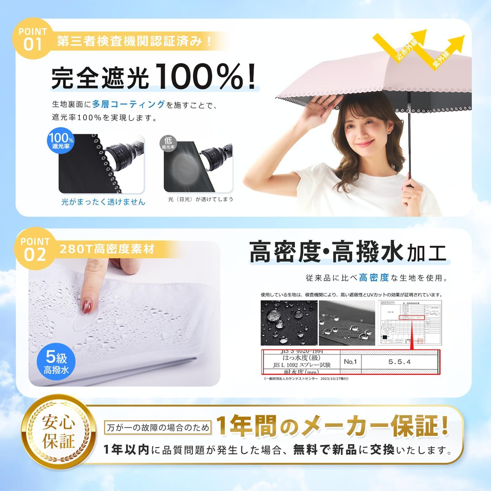 【完全遮光&UPF50+】 本製品は四層加工となっており、日焼け止め効果の高いブラックラバーコートを採用した完全遮光仕様のワンタッチ自動開閉 折りたたみ傘です。UVカット率は驚異の99.9%以上。真夏の強い日差しや紫外線からお肌をしっかり守ります。紫外線A波(肌の深層まで届く)・紫外線B波(肌を赤くする)・紫外線C波、全ての波長の紫外線を99.9%以上UVカット!これ一本で太陽光線や紫外線から徹底的にガードし、猛暑の日焼け対策アイテムとして最適です。日本の国家規格、JIS規格1925にてUVカット率99.9%以上%を実証。JIS規格1055にて遮光率100%の実証済み!完全遮光の最高級日傘です。素材選びから製造まで、徹底した品質管理の下で作り上げられてるため、日焼けによる劣化の心配もなく、耐久性が通常傘の約3倍です。