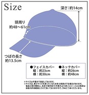 Size:深さ 約14cm 頭周り約48~61cm つばの長さ約13.5cm フェイスカバー縦:約23cm、横:約30cm ネックカバー 縦:約26cm、横:約48cm