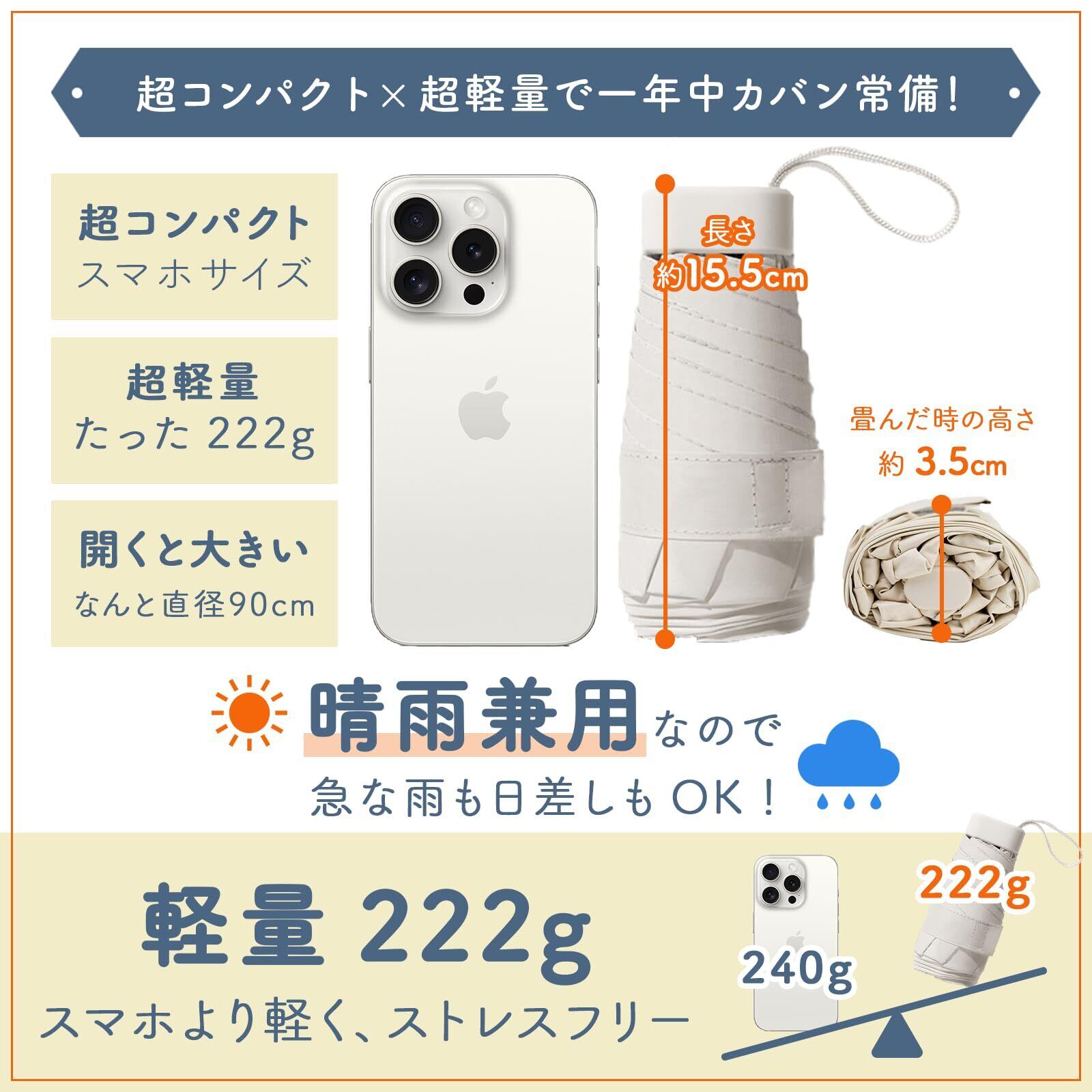 【超軽量222g 驚きのスマホサイズ】重さはiPhoneとほぼ同じ。ミニバッグの日も荷物が多い日もストレスなく持ち運べる小型×薄型の折り畳み傘です。折り畳んだ状態の本体の薄さはなんと3.5cm。高さは15.5cm。ポケットにも入る大きさです。