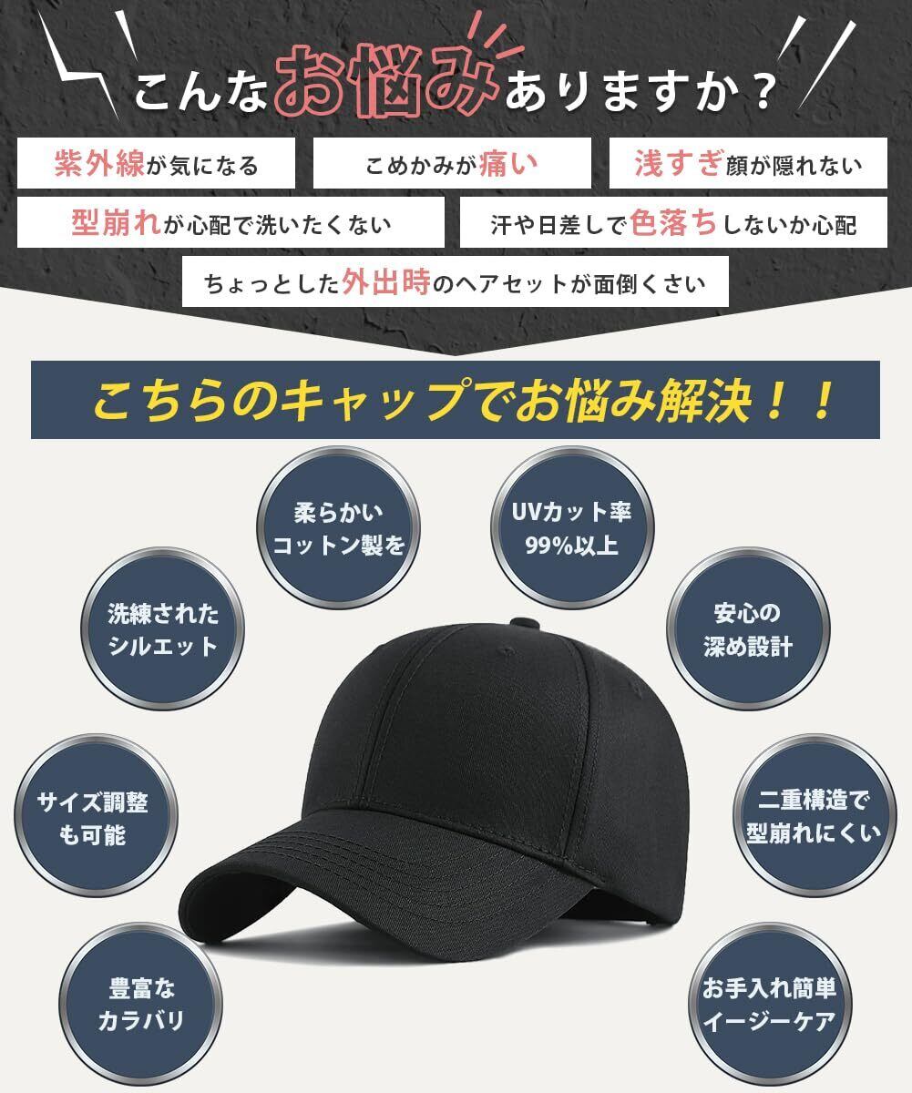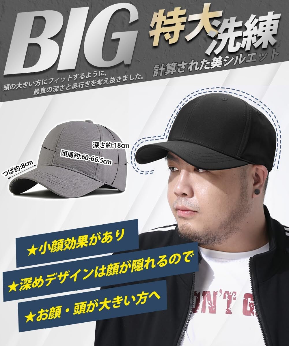 【大きいサイズのキャップメンズ】頭の大きい方に向きご用意したキャップ メンズです。頭周りは60cm以上であり、調整可能なので、お好みのサイズ感に被ることができます。つばの長さ約8cm、深さ約18cm、日本人の頭がた型にフィットし、日除け効果が高いです。また、深めの設計になりますのでフェイスラインを隠すことで小顔効果もあります。レディースも適用し、急なお出かけ時のスッピン隠しにも最適!