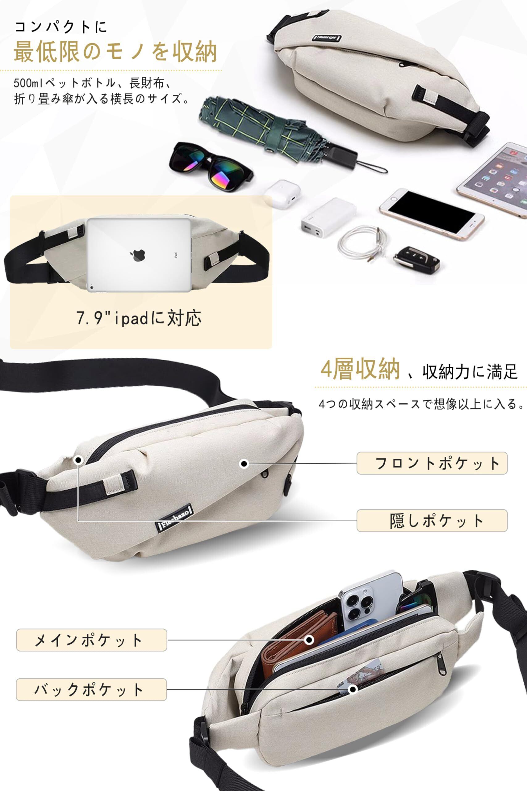 【4層収納、多ポケットのボディバッグ】①層.すっきりした前面ですが、1つもポケットがあります。しっかりと活用してみてください!!②層.バッグの中には、巧妙なポケットが隠されています。短い傘や水筒、500mlIのペットポトルなどを収納できます。③層.メイン収納はガバッと大きく開閉でき、整理できる小分けポケットを完備。さらに、内側はキーストラップを装備。④層.背面には隠しポケットが付き、財布、スマホなどの貴重品を入れても安心です。外行きのカジュアルバッグのバリュエーションをこのボディバックで増やしてみてはいかがでしょうか?後悔させません!!
