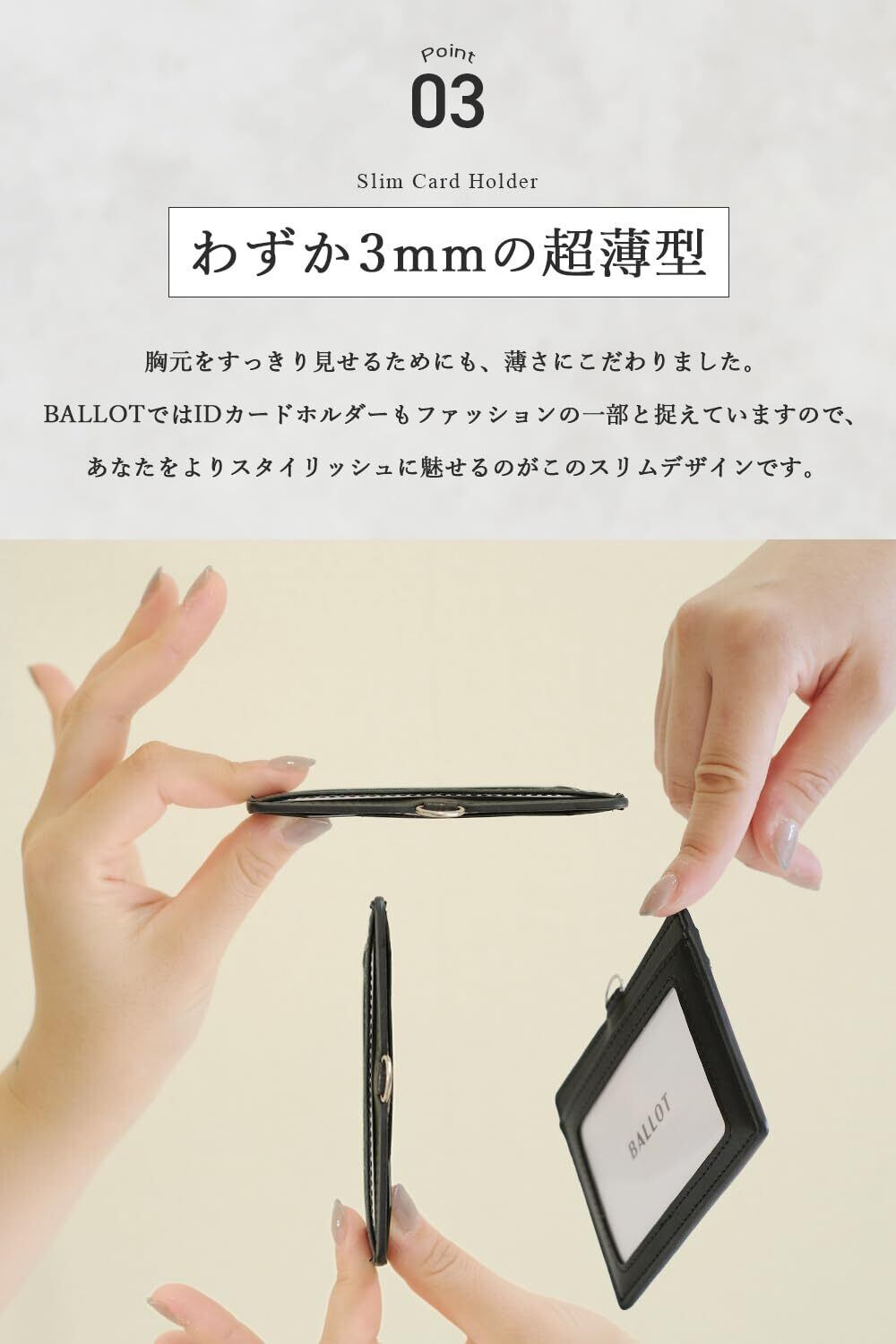 【わずか3mmの超薄型】厚さわずか3mmの超薄型設計により、胸元をすっきりと見せることができます。スリムなデザインはビジネスシーンだけでなく、ファッションアイテムとしても相性抜群。ポケットに入れてもかさばらず、軽やかで持ち運びやすいのも魅力です。IDカードホルダーもファッションの一部と考える方にぴったりです。