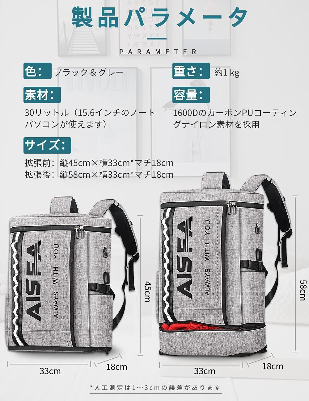 【大容量|拡張可能】サイズ:(45+13)cm*33cm*18cm 重量:約1KG 容量:約30L 人気のBOXスクエア型+幅広マチ、収納力抜群で、どんなシーンでも大活躍するリュックサックです。15.6インチPC、A4サイズの書類や2~3日分の着替えなど必要なアイテムたっぷりと入る可能で、スマートな仕分けポケット付き大容量バックパックです。手動測定のため、小さな誤差がある場合があります。