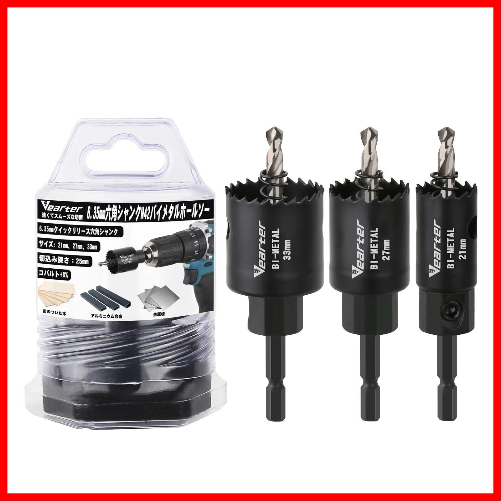 Vearter 3本組 バイメタルホールソーセット 21/27/33mm M42 木工用ドリル 六角軸 ホルソー 穴開けドリル アーバー付き バイメタルホールソー 金属、木材、板金、銅、石膏、PVC、スチールプレート、乾式壁用